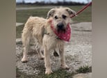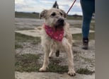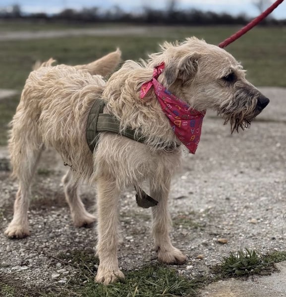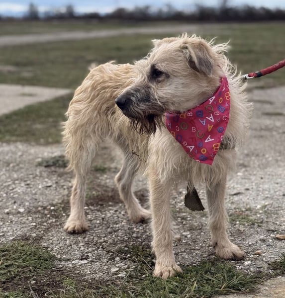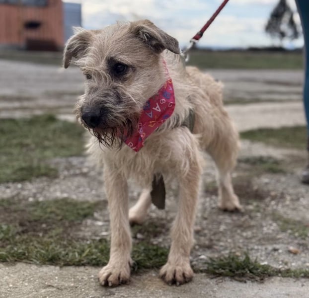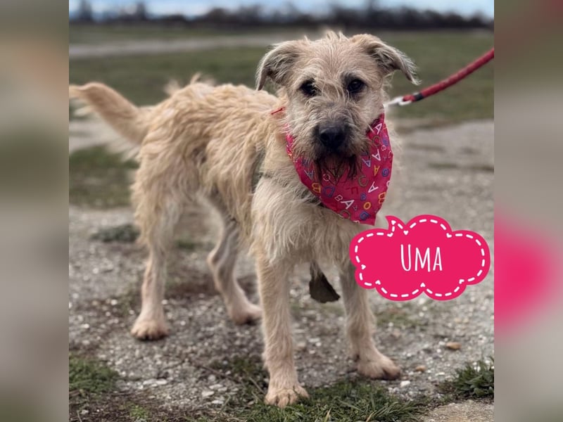 Uma ist ein Mädchen, sie ist laut Tierarztschätzung ca. 1 Jahr alt (geb. 01.10.2024), wiegt 15,6 kg und ist 51 cm groß. Vermutet wird ein Terrier-Mischling, der optisch ein wenig an einen kleineren Wolfshund erinnert.