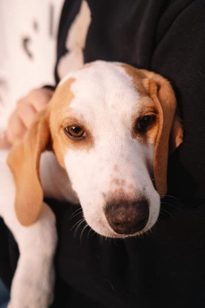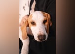 Sie ist die Schwester von Grom und Iskra, eine kleine Bracken-Mischlingshündin mit feiner Jagdhund-Seele. Optisch ist sie einfach bezaubernd: das helle Fell, die karamellfarbenen Ohren, die zarten Abzeichen und dieser ruhige, wache Blick. Sie wirkt fast ein bisschen nachdenklich – sensibel, aufmerksam und gleichzeitig neugierig.