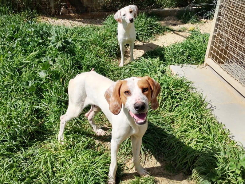 Camilla und Ciro wurden auf einer Straße eingefangen, nachdem Anwohner sie schon eine zeitlang beobachtet hatten. Tja, leider nicht verwunderlich, wir haben Jagdsaisonende und leider werden viele Jagdhunde ausgesetzt, damit man sie nicht über den Sommer versorgen muss….. Das ca. 2 Jahre alte Duo (Stand 03/2025) ist wunderschön und es dürfte sich um istrianische Bracken(mixe?) handeln. Diese Laufhunderasse wird als ruhig, anhänglich, klug, gehorsam, sensibel, verspielt und mit anderen Hunden als unkompliziert beschrieben. Sie sind geeignet als Jagd-, Begleit- und Familienhund. Dennoch ist das Auslastungsbefürfnis eher hoch und der Istrianer hätte gerne entsprechende Aufgaben. Wer einen tollen, sportlichen Begleiter an seiner Seite sucht und dies entsprechen berücksichtigt wird bei Ciro schnell fündig. Er ist ca. 19kg schwer und 52cm groß. Einen Test auf Mittelmeererkrankungen machen wir, sobald eine entsprechende Anfrage vorliegt.