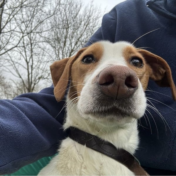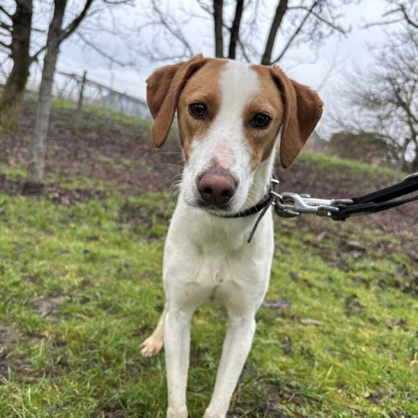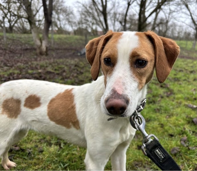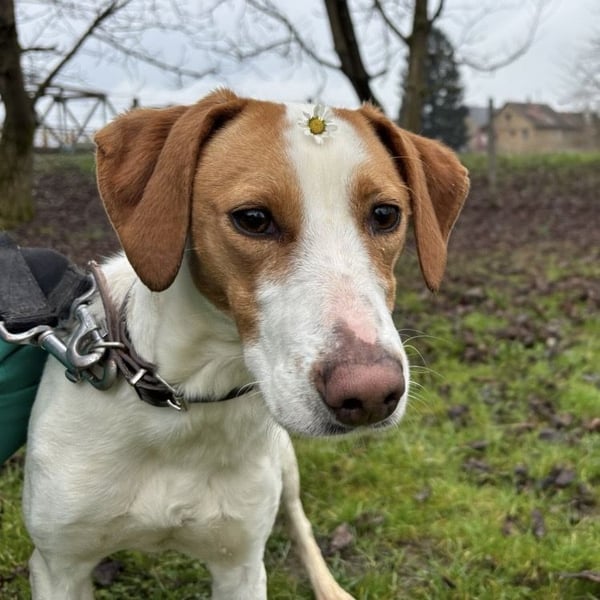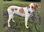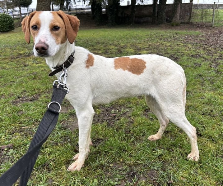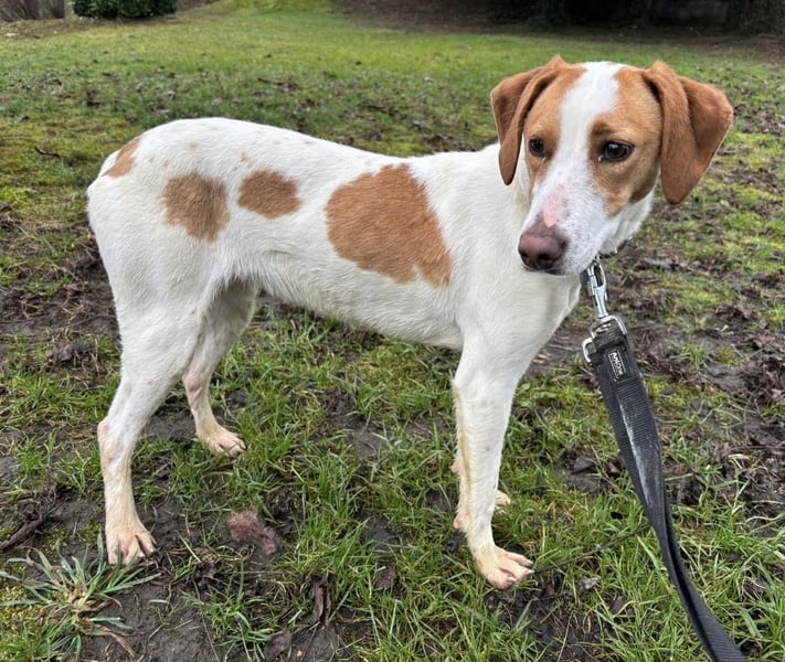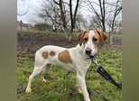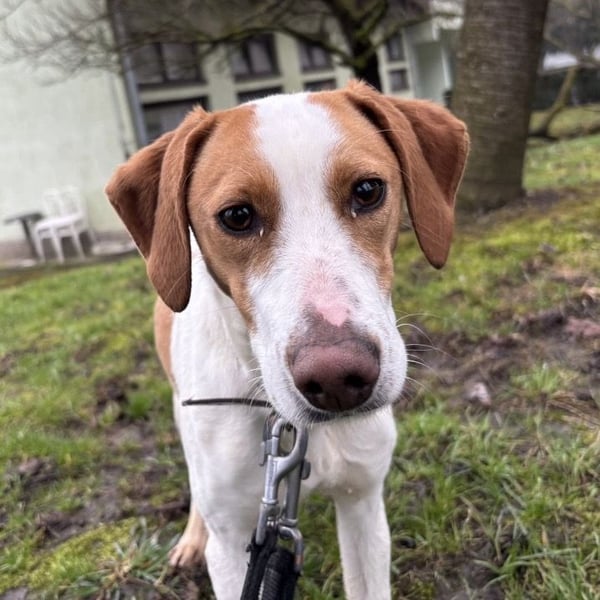 Bee ist ein Mädchen, laut Tierarztschätzung ca. 1 Jahr alt (geb. 25.01.2025), wiegt 12 kg und ist 51 cm groß. Vermutet wird eine Kurzhaar Istrianer Bracke (Posavski gonič).
