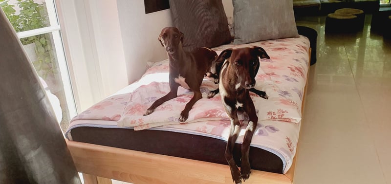 Der frühe Gartenauslauf und die täglichen Gartenspiele fördern den Muskelaufbau und sorgen dafür, dass sich die kleinen Räuber gut entwickeln. Gemeinsam mit Galgos aus dem Tierschutz (was wir nun 49 Jahre verantwortungsvoll leben), sind wir ein tolles Rudel.... sie sind daher an große Hunde gewöhnt...