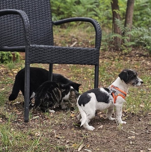 Moina zeigt sich von ihrer verträglichen Seite und kommt mit allen gut zurecht, bei den hundeerfahrenen Katzen verhält sie sich freundlich und beschwichtigend.