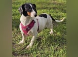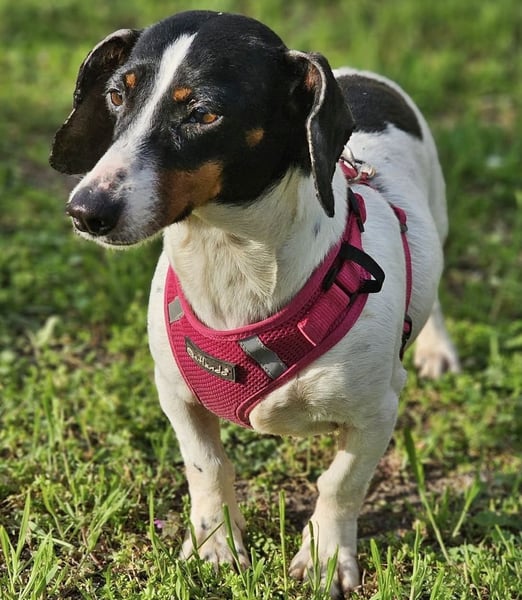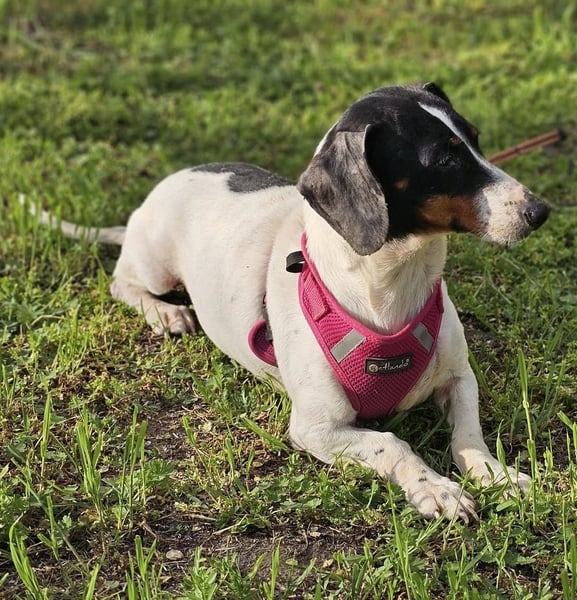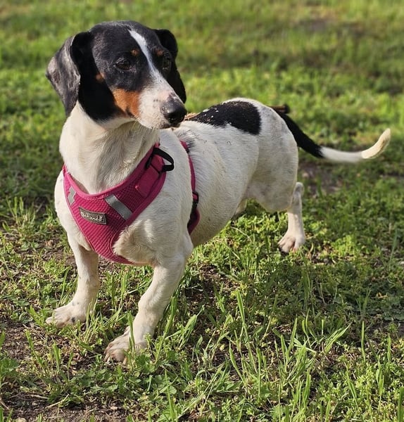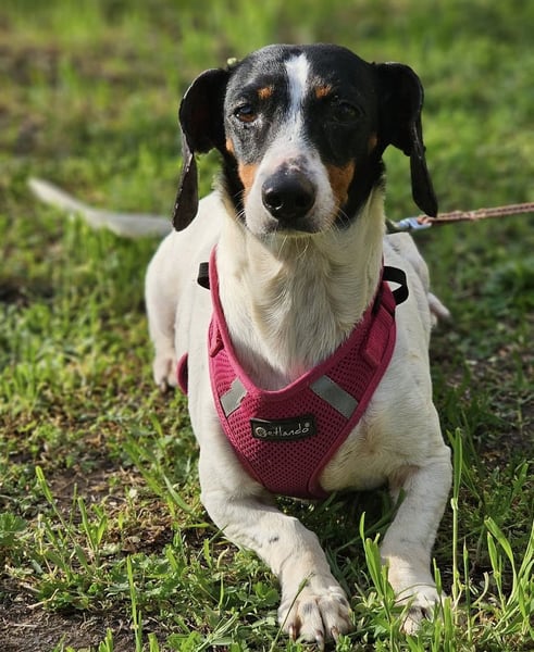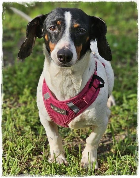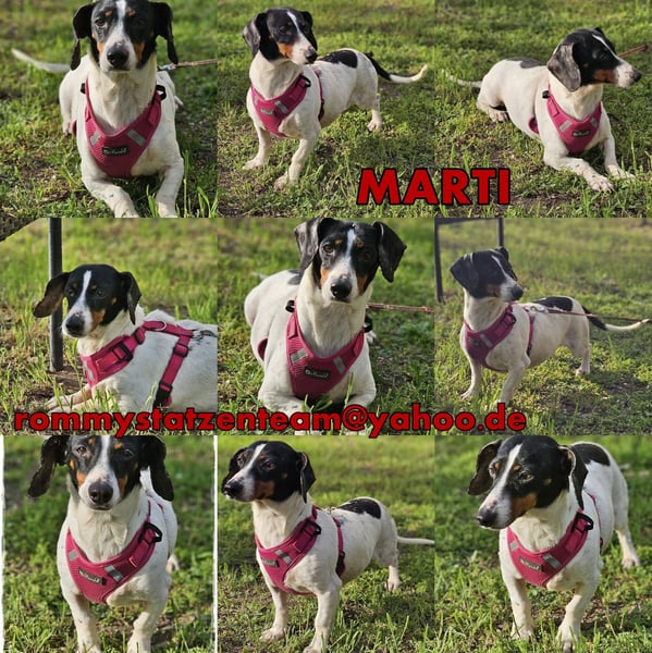 Marti, Hündin, Jack Russell-Dackel Mischling, geboren ca. 22. April 2021 (von einem ungarischen Tierarzt geschätzt), kastriert, Schulterhöhe: ca. 29 cm und ca. z.Z. 7,5-8,5 Kilo (Hals: 27-32 cm, Brust: 51-56 cm), Vermittlung zu Katzen: sie ist nicht kompatibel mit Katzen.