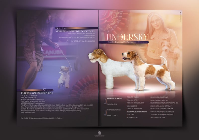 Die eingestellten Fotos zeigen die Hündin in verschiedenen Entwicklungsphasen und veranschaulichen, wie schön sie sich entwickelt. Auf einer Grafik sind außerdem ihre Eltern mit entsprechenden Informationen dargestellt.