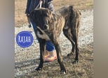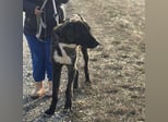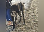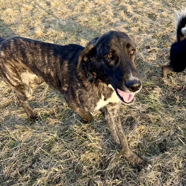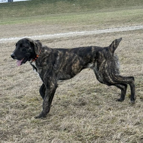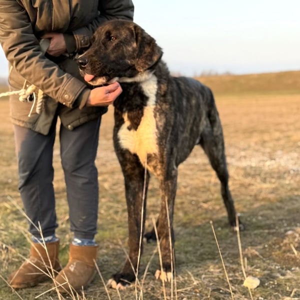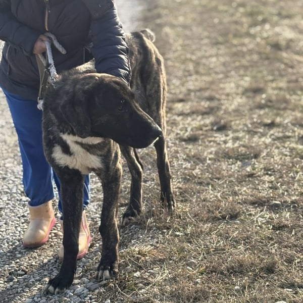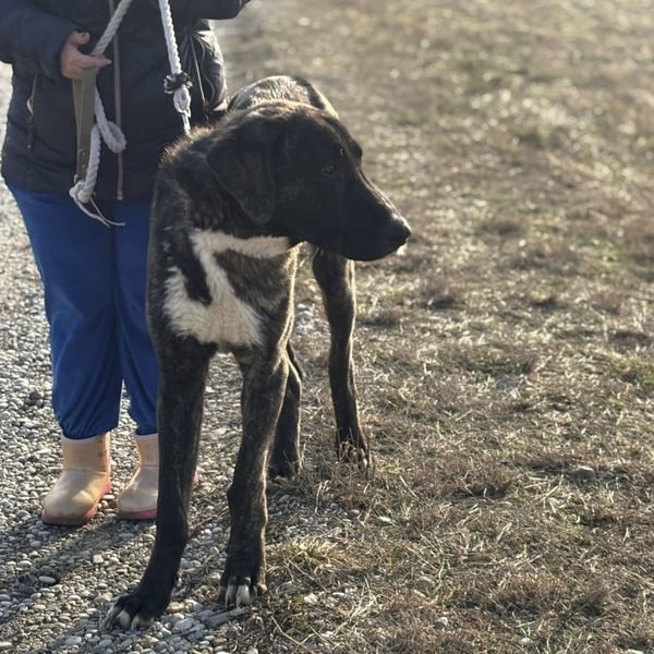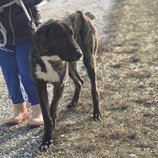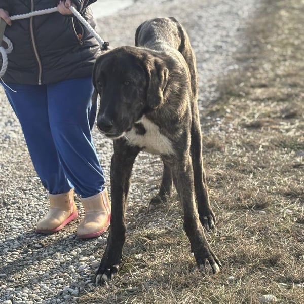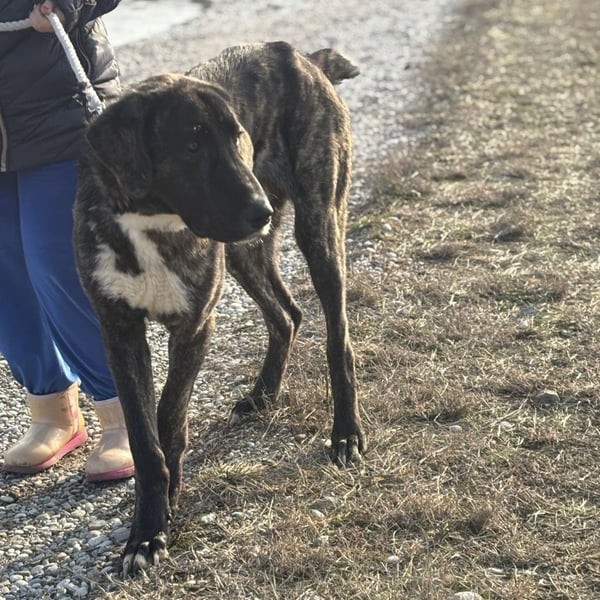 Rajah ist ein Rüde, laut Tierarztschätzung ca. 1 Jahr alt (geb. 07.02.2025), misst knapp 80 cm Schulterhöhe und wiegt derzeit etwa 40 kg. Als er übernommen wurde, war er extrem abgemagert, fast wie ein Skelett – er muss noch etwas an Gewicht zulegen. Welche Rasse in ihm steckt, ist nicht bekannt, optisch erinnert er an eine Mischung aus Deutscher Dogge, Kangal und Windhund, ein sehr großer, eleganter, imposanter Hund mit besonderer Ausstrahlung. Er hat eine kurze Rute, wir wissen nicht ob er so geboren oder diese absichtlich kupiert wurde.
