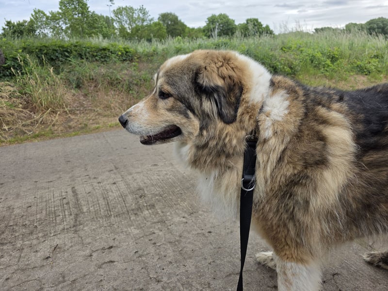 Dickie ist ein beeindruckender Rüde mit ruhiger Ausstrahlung und einem bemerkenswert liebevollen Wesen. Als Kaukase Lurcher Mix vereint er körperliche Präsenz mit Intelligenz und eigenständigem Charakter. Nach dem Tod seines Besitzers sucht er nun ein neues Zuhause bei Menschen, die über Erfahrung und ein gutes Gespür für souveräne Hunde verfügen.