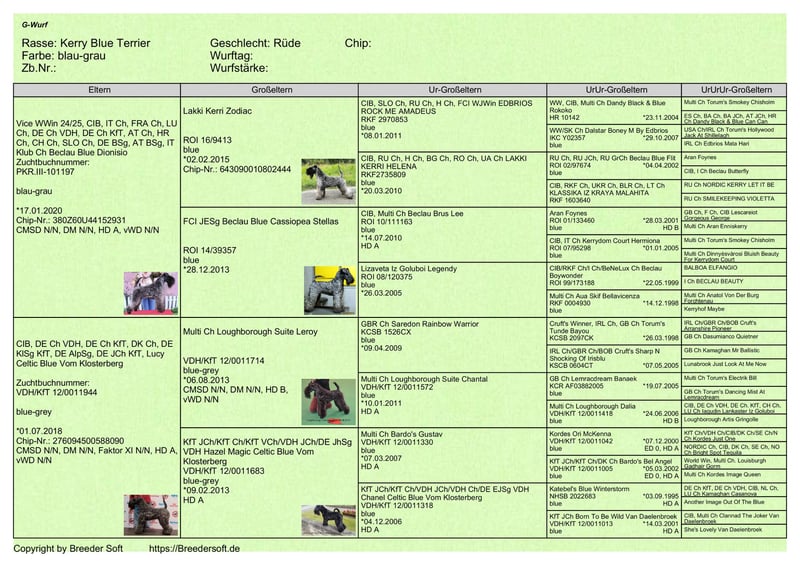 Der Vater ist Beclau Blue Dionisio. Es handelt sich um einen wunderschönen Rüden aus der Zucht und im Besitz des seit über 30 Jahren züchtenden Kennel „Beclau“ aus Italien. Er besitzt eine HD-A Hüfte und ist komplett frei von den Erbkrankheiten vWD, DM und CMSD. Dionisio ist ein sehr erfolgreicher Ausstellungshund und Champion in vielen Ländern wie z. B. Italien, Deutschland, Frankreich, Luxemburg usw. Außerdem wurde er 2024 und 2025 Vize Weltsieger der Kerrys.