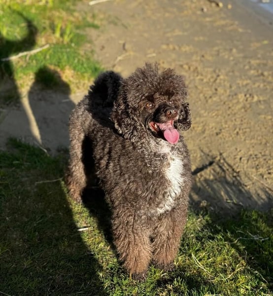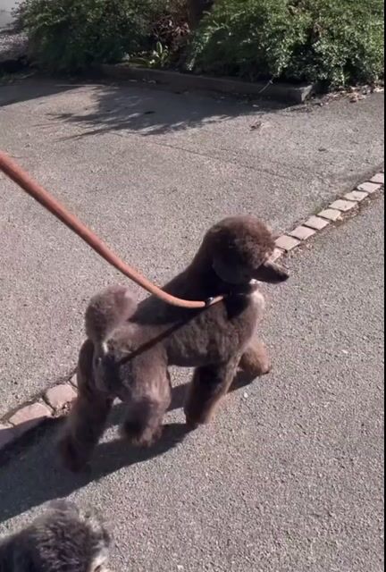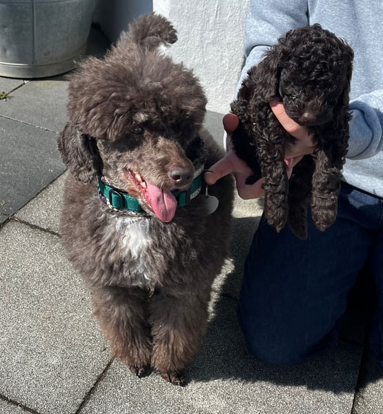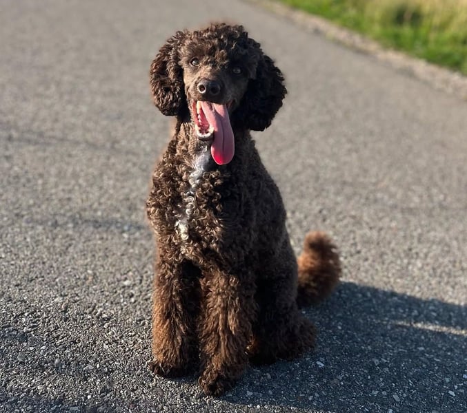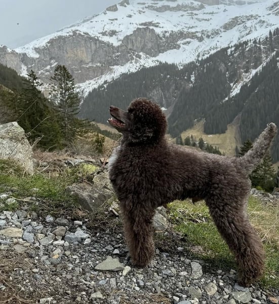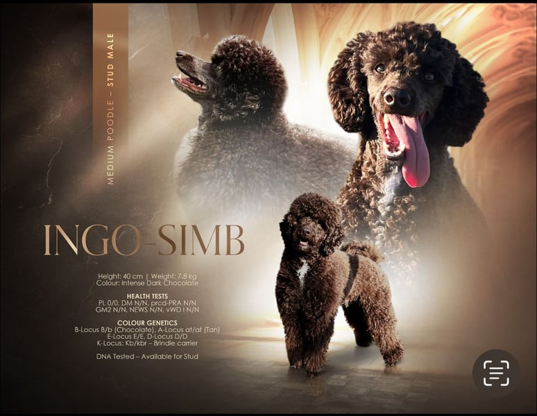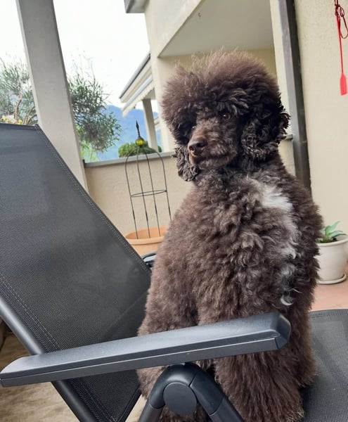 Viele braune Pudel hellen mit zunehmendem Alter deutlich auf ? Ingo-Simba hingegen zeigt ein bemerkenswert farbstabiles, tiefes Braun, was genetisch äußerst wertvoll und in dieser Intensität vergleichsweise selten ist.