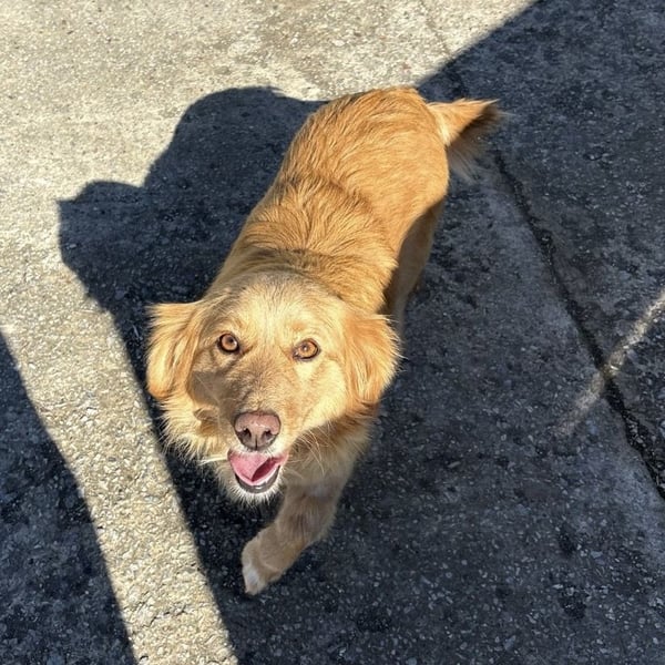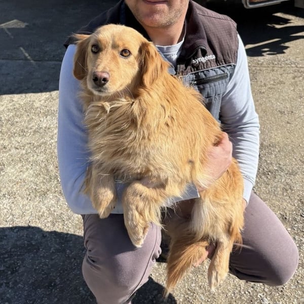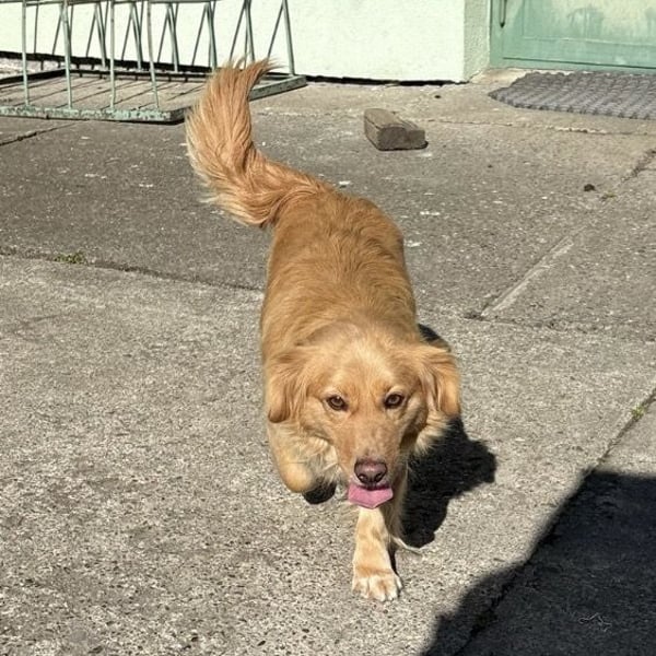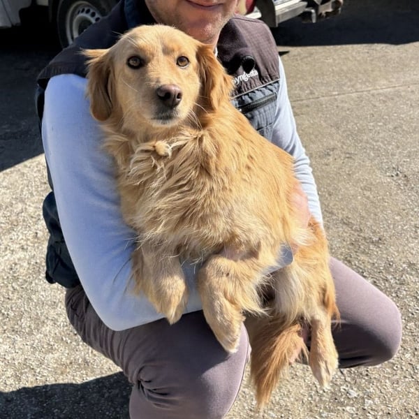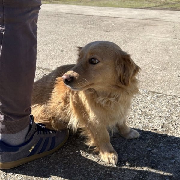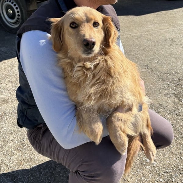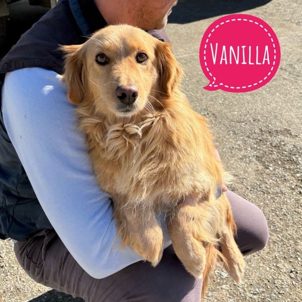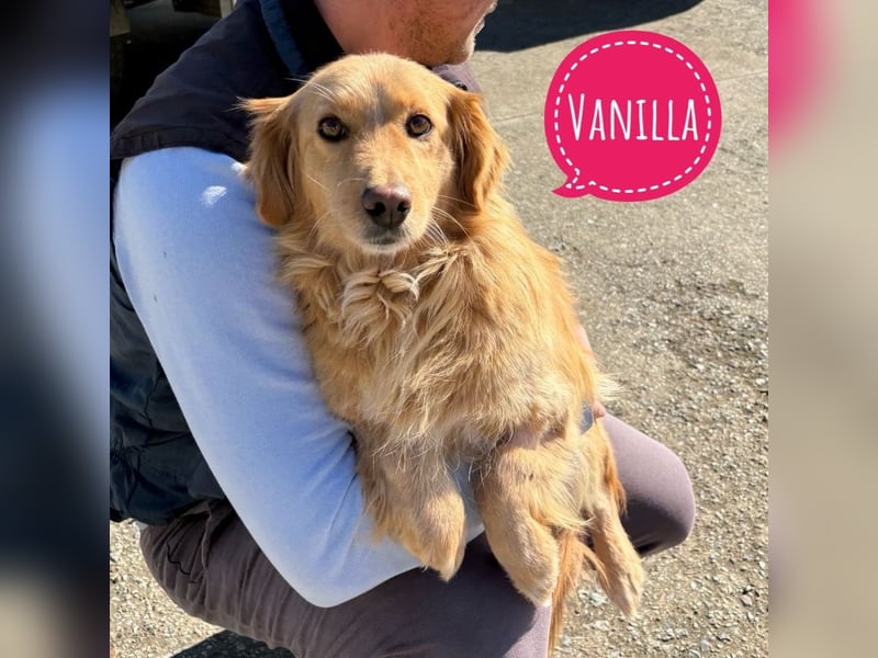 Vanilla ist ein Mädchen, sie ist laut Tierarztschätzung ca. 2,5 Jahre alt (geb. 08.07.2023), wiegt 11 kg und ist 30 cm groß. Vermutet wird ein Kokoni-Retriever Mischling.