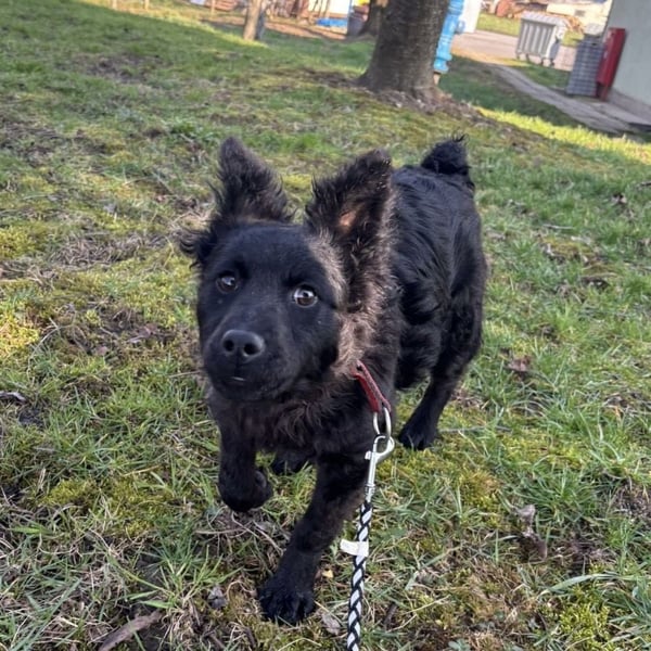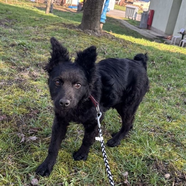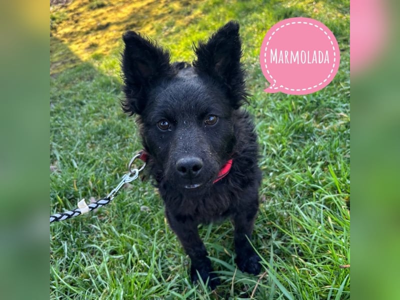 Marmolada ist ein Mädchen, laut Tierarztschätzung ca. 3 Monate alt (geb. 27.11.2025), aktuell 8,6 kg schwer und 34 cm groß. Vermutet wird ein Mudi - Kroatischer Schäferhund Mischling. Ausgewachsen wird sie voraussichtlich klein bis mittelgroß (ca. 18–20 kg). Sie wurde mit kurzer Rute geboren.