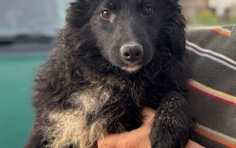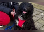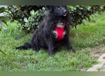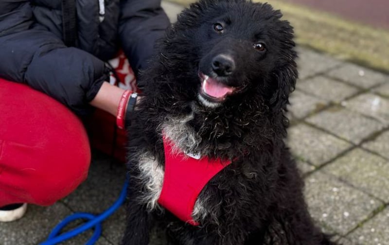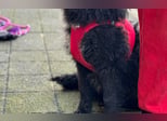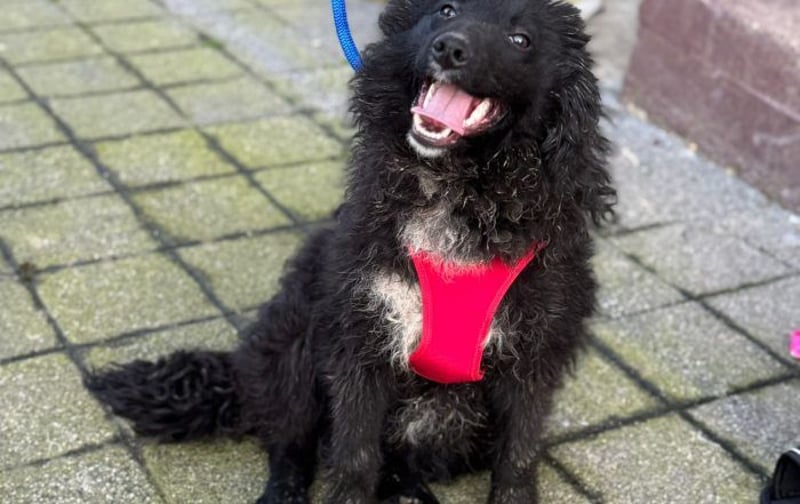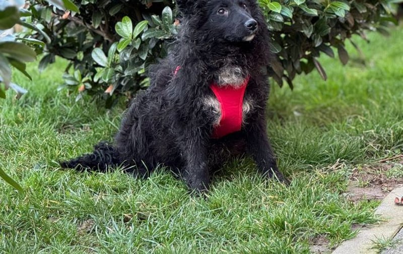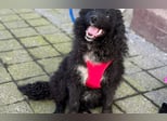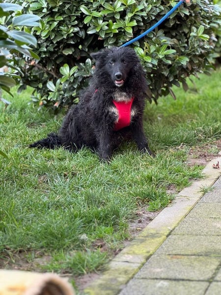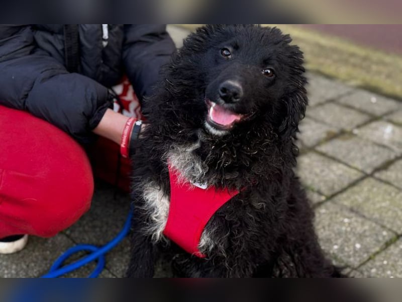 Schwarzes, leicht gelocktes Fell, dazu diese süße helle Brustzeichnung – wie ein kleines gemaltes Herz auf vier Pfoten.