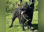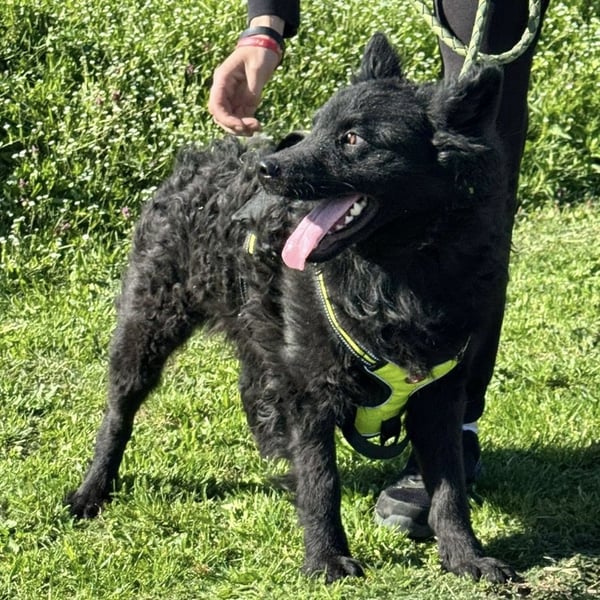 Sein wunderschönes, leicht lockiges Fell macht ihn zu einem echten Hingucker. An der Leine läuft er bereits sehr schön und orientiert sich gut am Menschen.
