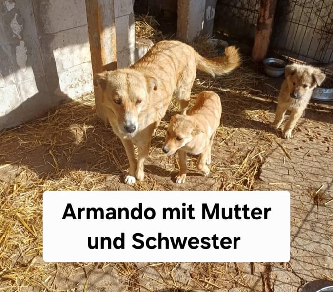Armando wurde im Oktober 2025 in Rumänien geboren und wurde zusammen mit seiner Mutter und seiner Schwester aus der Tötung Targu Jiu gerettet. Armando hat eine Schulterhöhe von 45 cm, er befindet sich noch im Wachstum und wiegt zur Zeit etwa 10 kg. Seine Pflegestelle beschreibt ihn wie folgt: