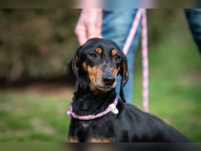 Orina ist lieb und freundlich, im Umgang zeigt sie sich noch etwas unsicher. Aber sie sucht die Nähe zum Menschen und freut sich über Ansprache und Streicheleinheiten. Man merkt ihr an, dass sie dazugehören möchte. In ihr steckt ein Dackel und mit wachsendem Selbstvertrauen wird sie sich ganz sicher auch zu einem typischen Vertreter ihrer Rasse entwickeln. Orina durfte noch nicht allzu viel kennenlernen und muss erst noch Alltagsroutinen, alltägliche Dinge und das Zusammenleben gezeigt bekommen. Auch das Hunde-ABC steht noch auf ihrem Stundenplan.