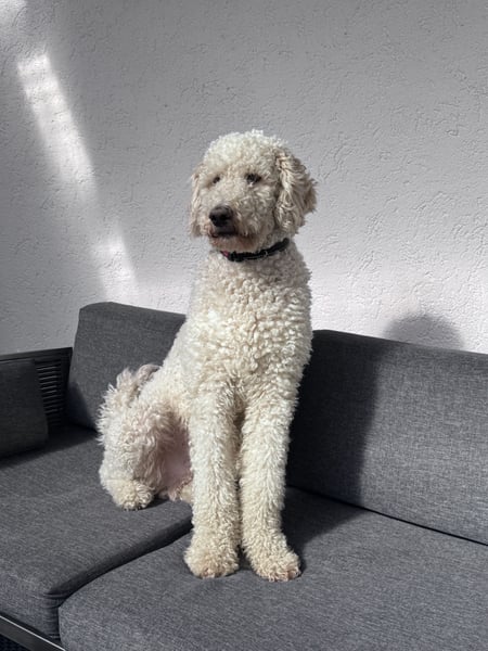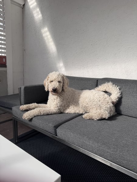 Er haart nicht, wie es Labradoodle-typisch ist, und ist an einen ruhigen Familienalltag sowie an das Wohnen in der Wohnung gewöhnt.