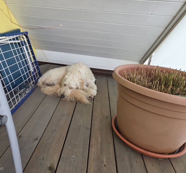 Sie kennt lange Wanderungen, ist zuhause aber entspannt und liegt auf ihrem Platz. Ich würde sie als sehr ausgeglichen bezeichnen.