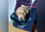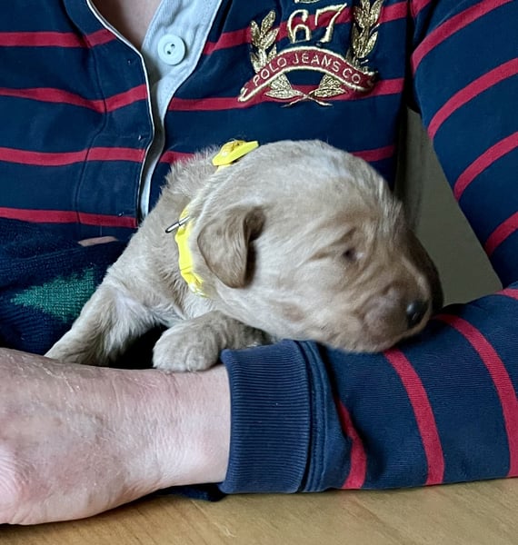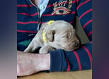 Hellblau ist ein Rüde. Er hat einen kleinen weißen Fleck auf der Brust