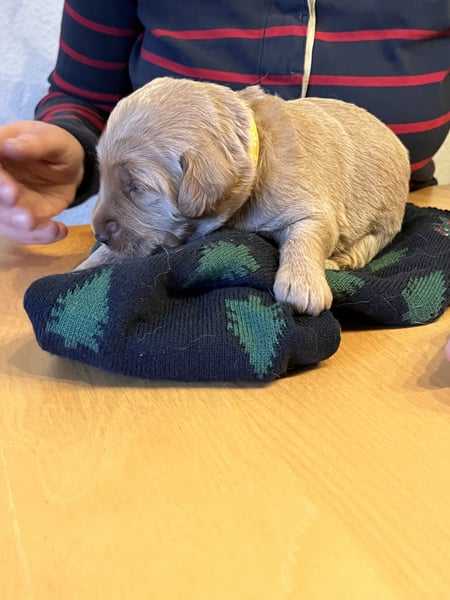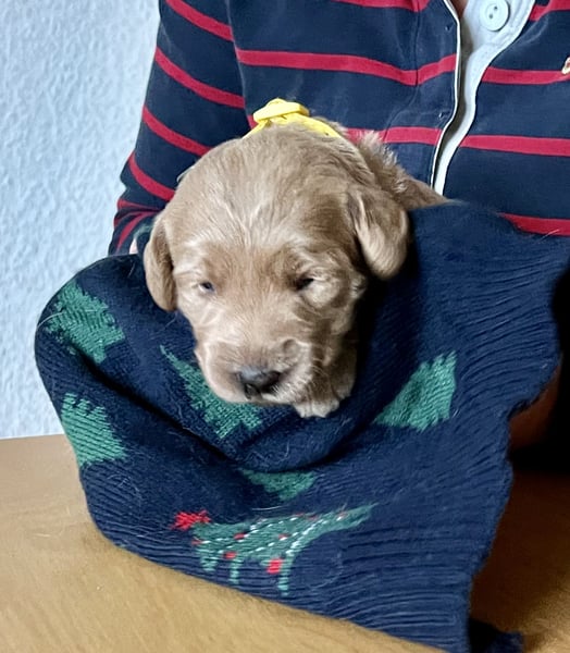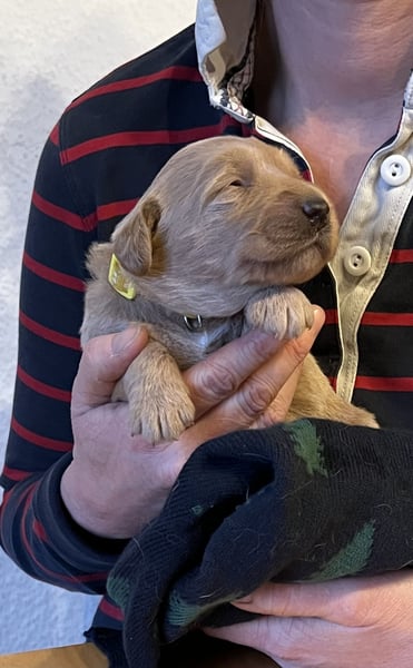 Gelb ist eine Hündin. Sie hat einen kleinen weißen Fleck auf der Brust