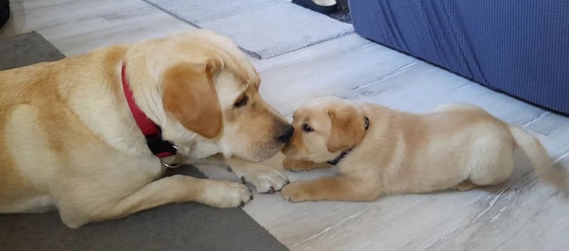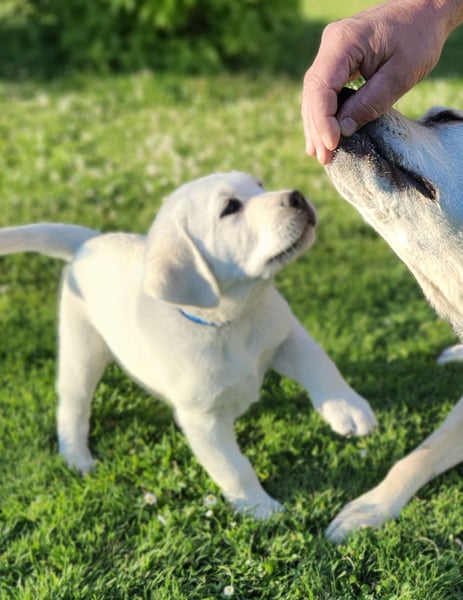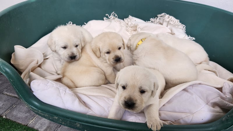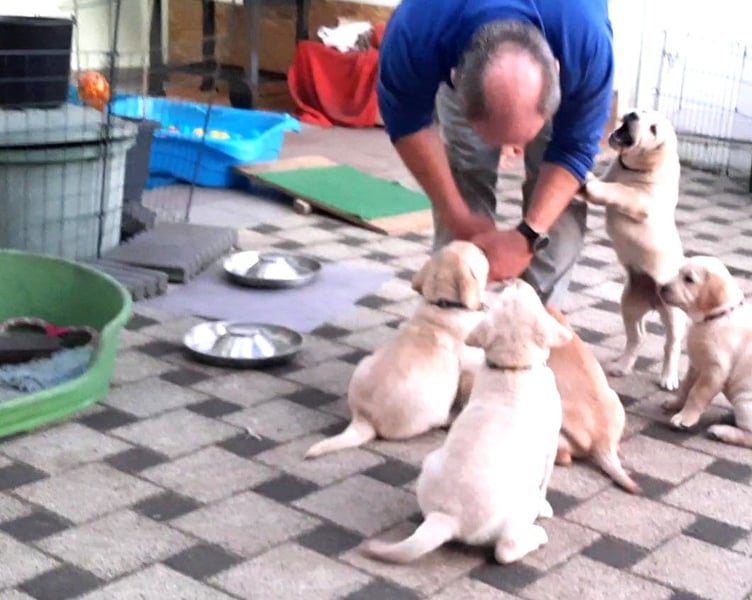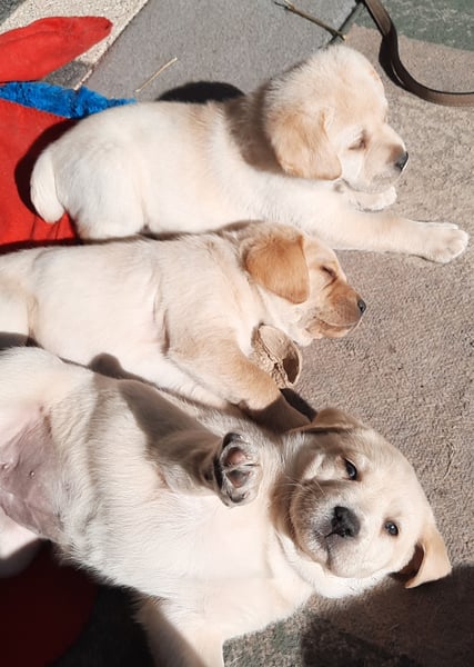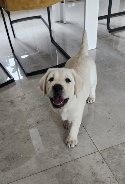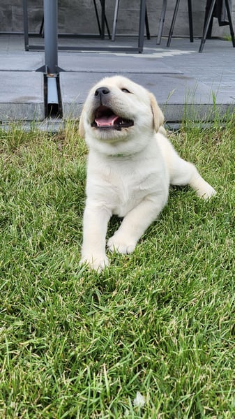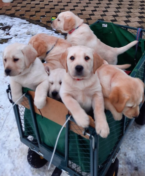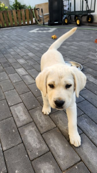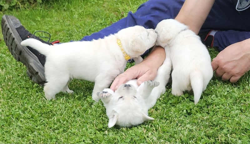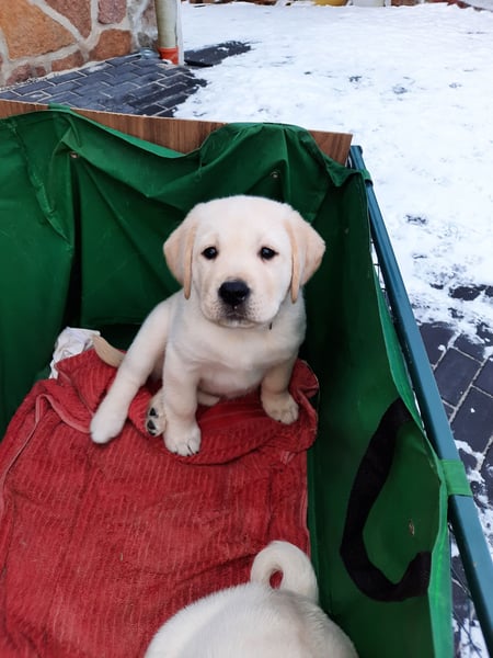 Unsere Familienhündin hat weiße/gelbe kräftige, gesunde Welpen aus der Showlinie zur Welt gebracht. Es ist noch 1 Hündin frei. Die Eltern haben ausgezeichnete tierärztliche Untersuchungsergebnisse (HD, ED, OCD, PRA, HNPK, EIC, Augen, Gebiss,..) wurden genetisch getestet und sind uneingeschränkt zuchttauglich. Die Ahnentafeln und Gesundheitsergebnisse können vor Ort eingesehen werden. Die Welpen wachsen im Haus und Garten auf, lernen Geräusche innen und außen kennen sowie Besuch, Kinder, Autos etc. Sie können motorische Fähigkeiten erlernen (Bällebad, Wackelbrett, Wippe, Schräge) lernen die verschiedensten Untergründe wie glatte Fliesen, Teppich, Gitterroste, Steine, Rasen, Sand kennen). Wir haben schon eine Autofahrt gemacht und sie waren im Bollerwagen unterwegs.