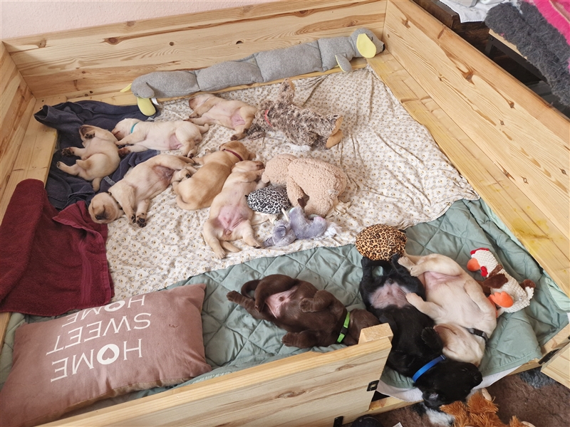 Unsere Welpen werden ab der 9. Woche abgegeben (je nach Entwicklungsstand), dann sind die Kleinen geimpft, gechipt und entwurmt (ab der 2. Lebenswoche alle 2 Wochen). Während dieser Zeit lernen die Kleinen jegliche Altagsgeräusche kennen und werden von uns auch ans Autofahren gewöhnt. Die Babys wachsen selbstverständlich bei uns im Haus auf und werden der Mittelpunkt unserer Familie sein. Wir werden auch versuchen den Kleinen ein paar Grundkomandos beizubringen, wie z. B. nur auf Komando fressen, Sitz usw.. Aber meistens funktioniert es bei großen Würfen nicht richtig. Die Welpen lernen bei uns andere Hunde, Katzen, Kaninchen, Enten, Hühner und Pferde kennen. Wir ziehen die Welpen sehr liebevoll auf und haben bisher nur positives Feedback erhalten.