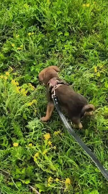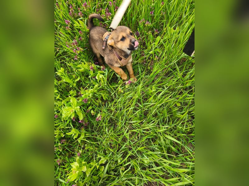 Neugierig, aufmerksam und offen entdeckt der noch 23 cm kleine Labrador-Mischlingsrüde (noch im Wachstum), aktuell 4 kg leicht, Schritt für Schritt die Welt.