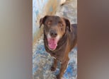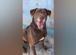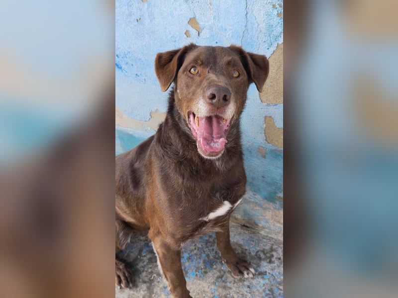 Er wurde ohne Mikrochip gefunden und keiner suchte ihn und er wartet und wartet und hofft, dass seine Besitzer zurückkommen. Er lächelt jeden an aber keiner kommt, um ihn zu befreien.