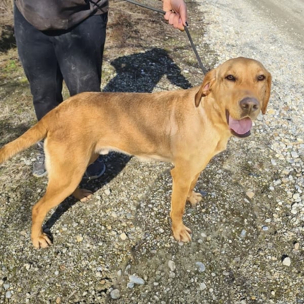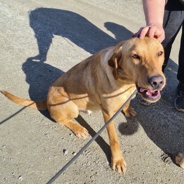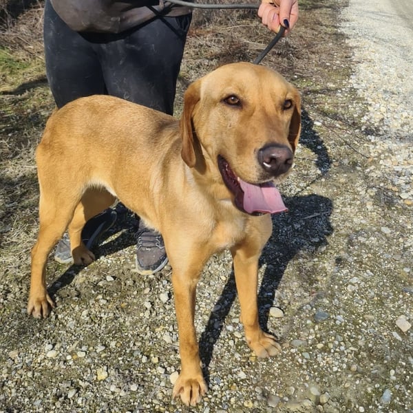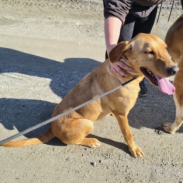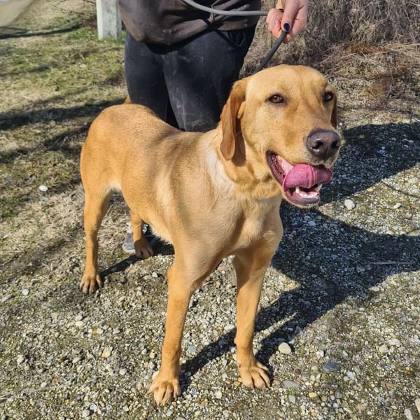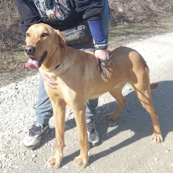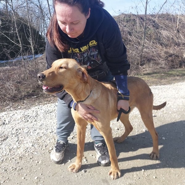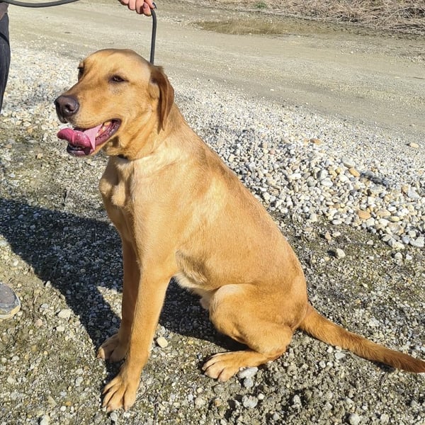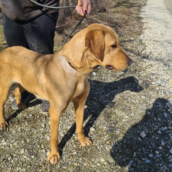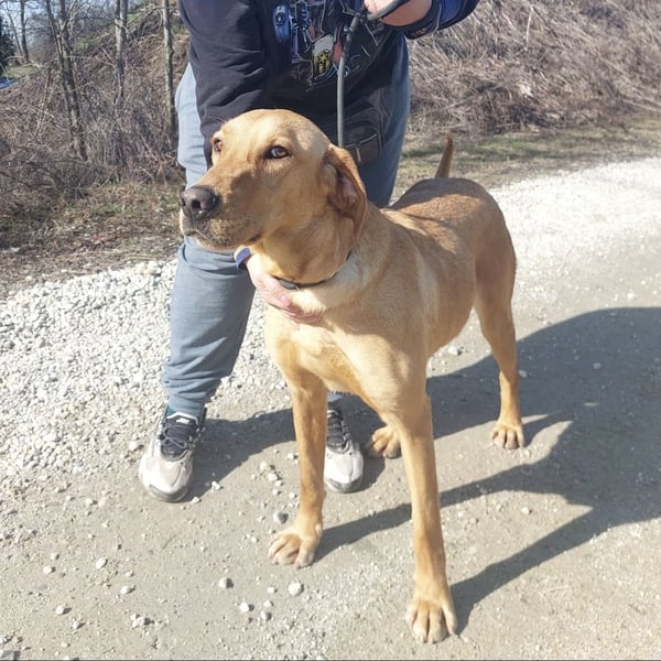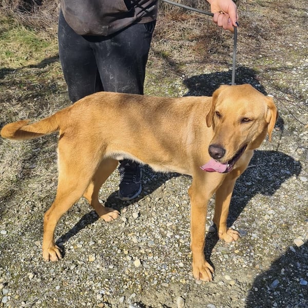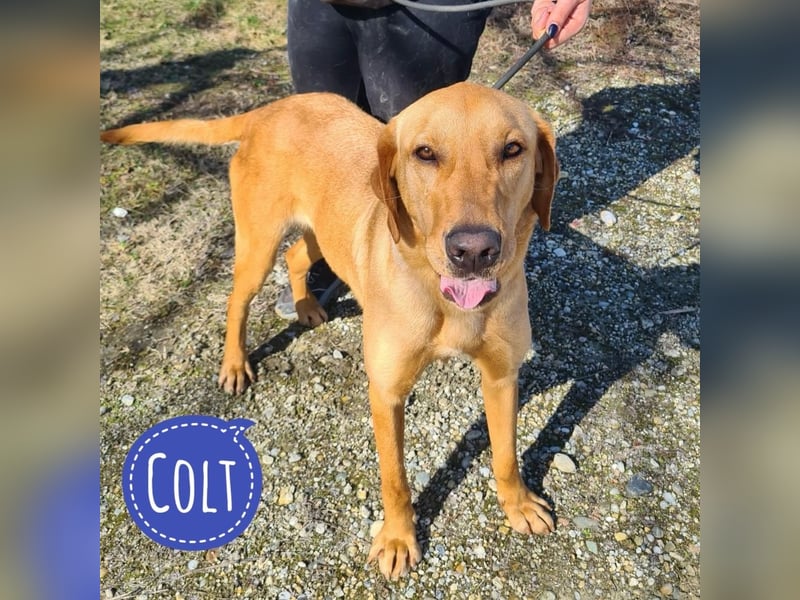 Colt ist ein Bub, laut Tierarztschätzung ca. 2 Jahre alt (geb. 25.03.2024), wiegt 34 kg und ist 71 cm groß. Vermutet wird ein Labrador–Magyar Vizsla Mischling.