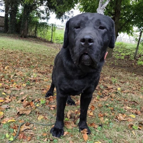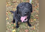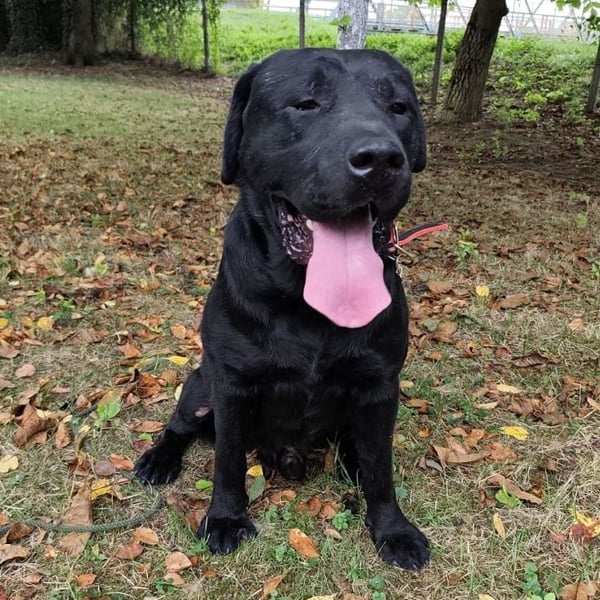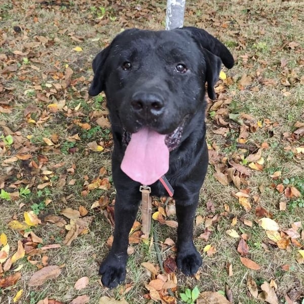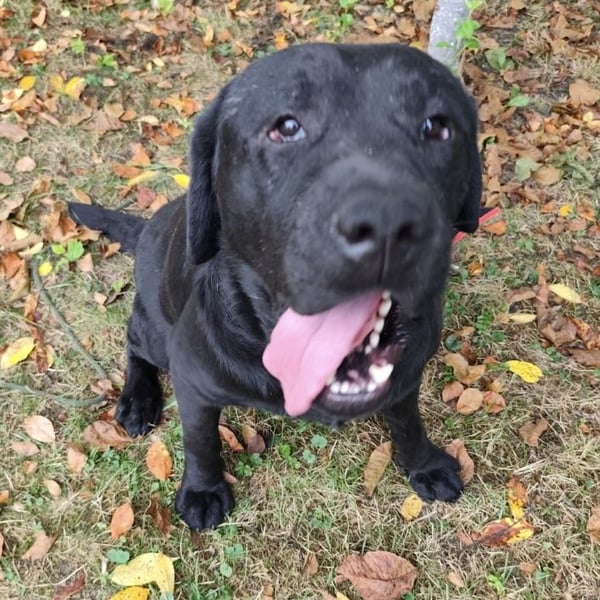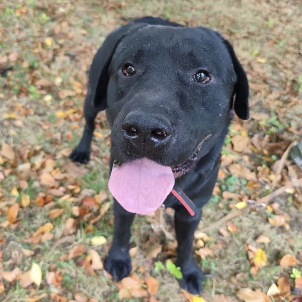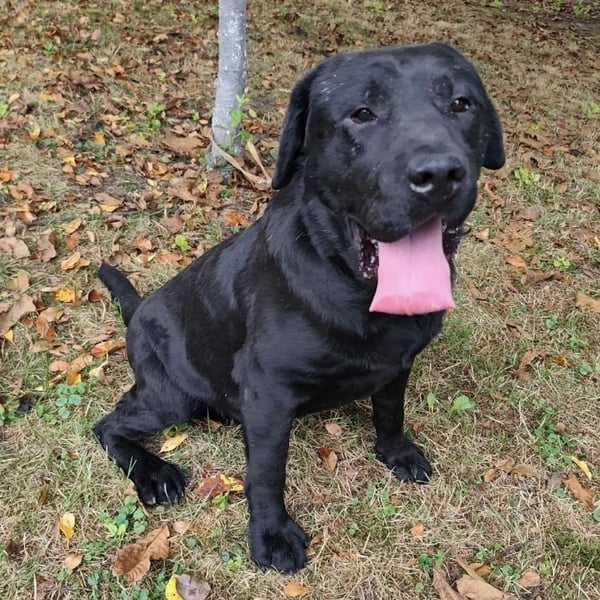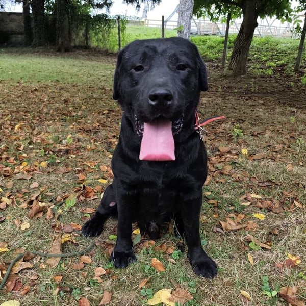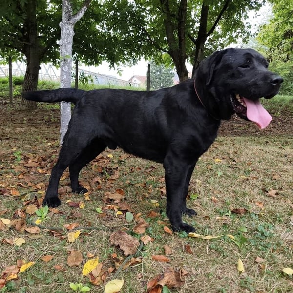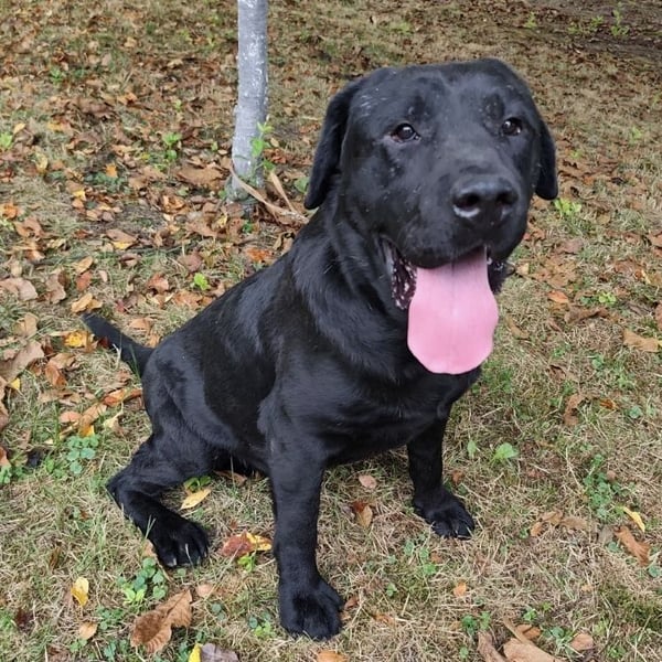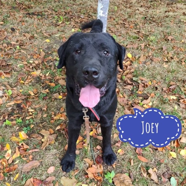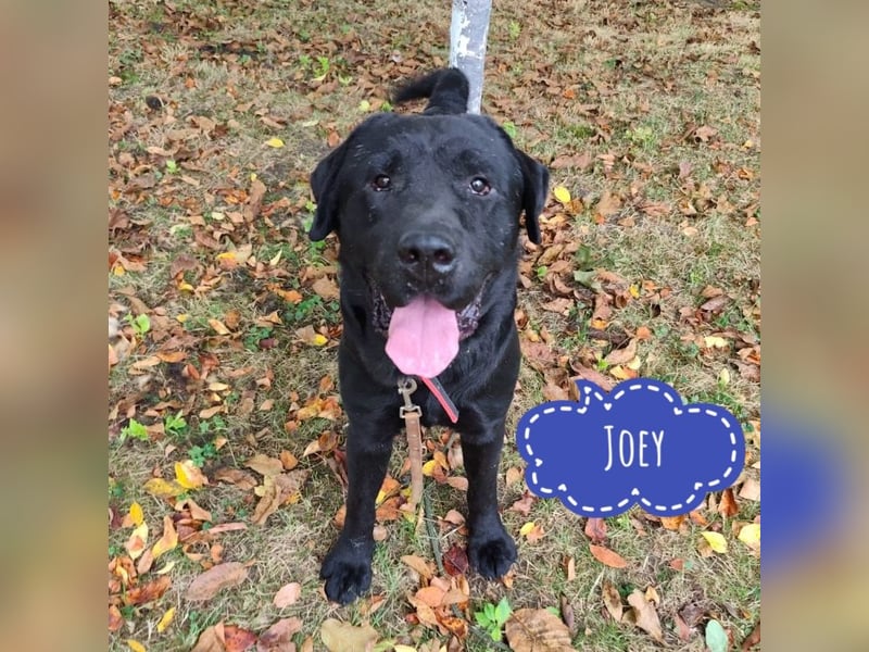 Joey ist ein Bub. Er ist laut Tierarztschätzung ca. 2 Jahre alt (geb. 10.02.2023), 66 cm groß und wiegt 41 kg. Vermutet wird ein Labrador (Mix?).