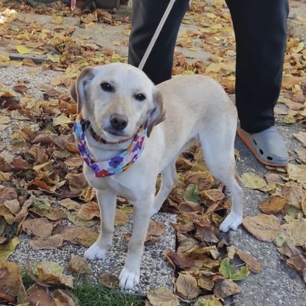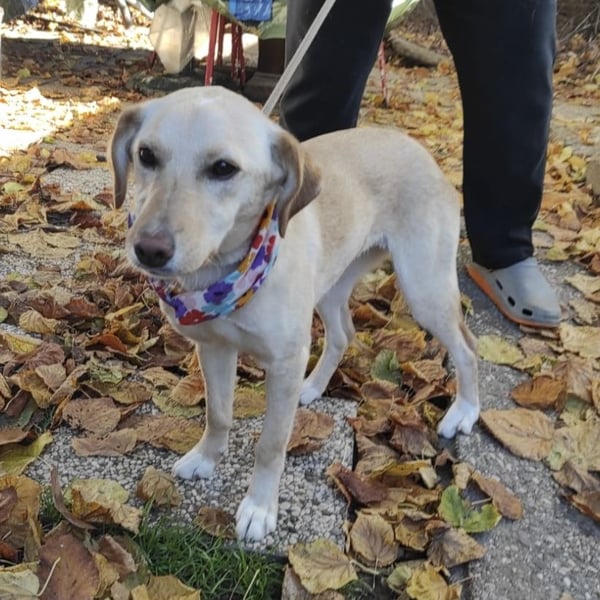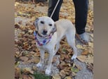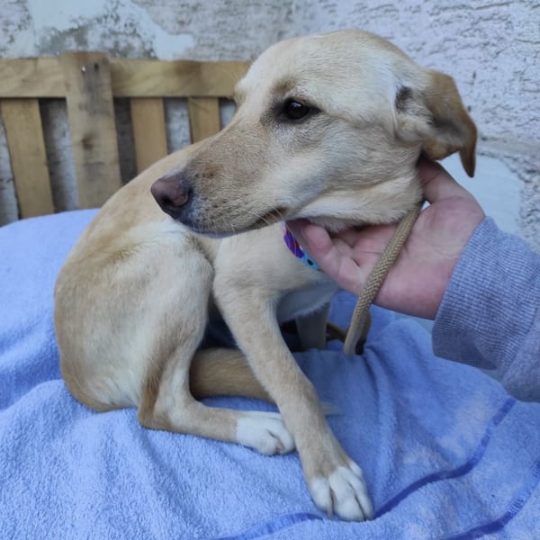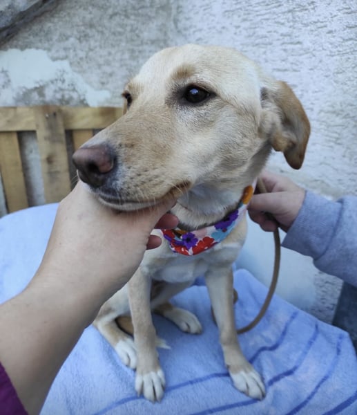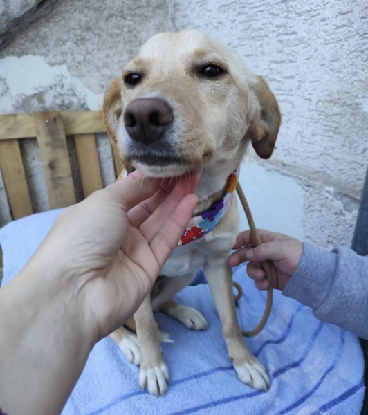 Ajša (Aischa) ist laut Tierarztschätzung zur Zeit etwa 11 Monate alt (geb. 19.01.2025), wiegt nur ca. 10 kg und ist 39 cm groß. Vermutet wird ein Labrador, mit einer sehr kleinen Hunderasse gemischt.