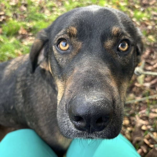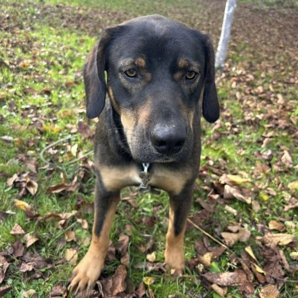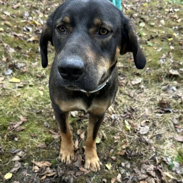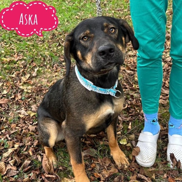 Aska ist ein Mädchen, laut Tierarztschätzung ca. 2 Jahre alt (geb. 08.03.2023). Sie ist etwa 50 cm groß und wiegt rund 30 kg. Vermutet wird ein Labrador–Bracke-Mix.