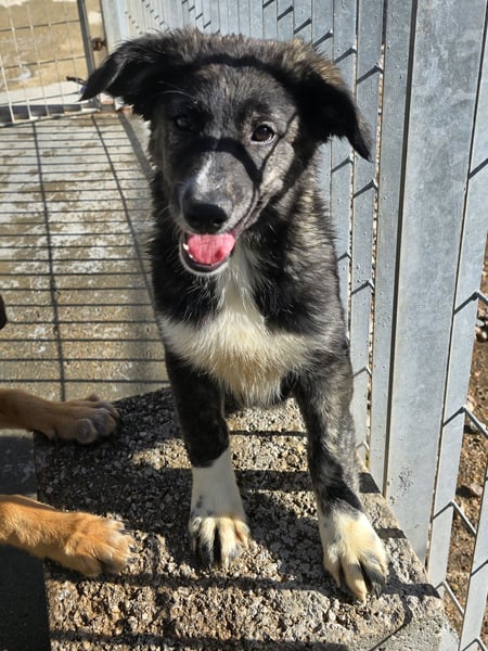 Pesca ist eine graugestromte freundliche Hündin mit Schalk im Nacken. Kein Schnürsenkel ist vor ihr sicher, sie findet die Leckerchen in den Taschen und weiß, wie man den Stift aus dem Beutel holt. Sie hat Charme und ihre Lebensfreude ist ansteckend.