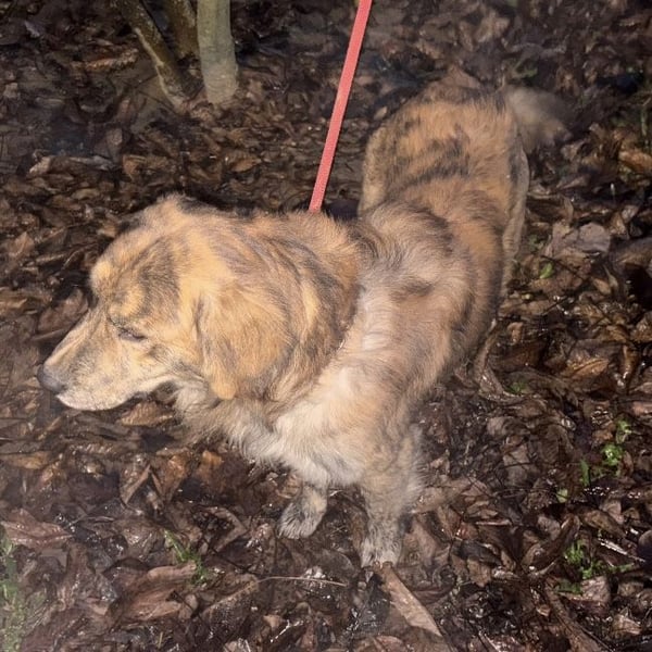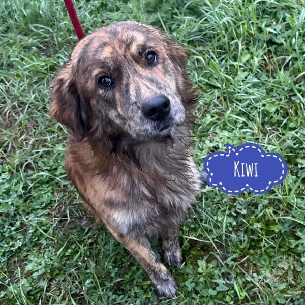 Kiwi ist ein Rüde, laut Tierarztschätzung ca. 2 Jahre alt (geb. 06.11.2023), wiegt 25 kg und ist 50 cm hoch. Vermutet wird ein Retriever - Bardino Mischling.