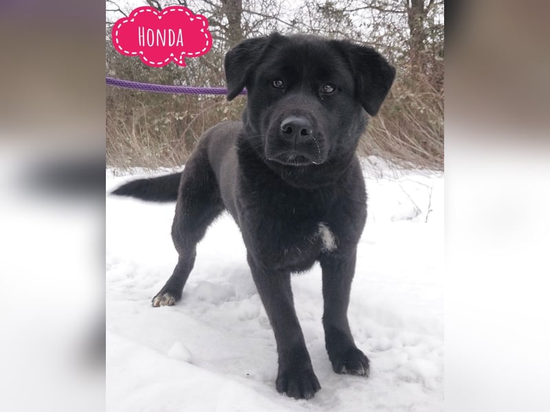 Honda ist ein Mädchen, sie ist laut Tierarztschätzung ca. 1,5 Jahre alt (geb. 17.09.2024), wiegt 27 kg und ist 55 cm groß. Vermutet wird ein Labrador - Akita Mischling.