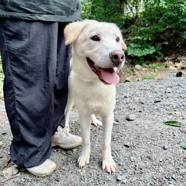 Daon ähnelt gemeinsam mit seinem Bruder Maon einem gelben Labrador, sein Fell ist jedoch etwas heller und eher cremefarben. Er ist ein besonders verschmuster und freundlicher Hund, der Spaziergänge und gemeinsame Zeit mit Menschen liebt. In den Sozialisierungsstunden hat er schnell gelernt, dass Menschen Umarmungen, Spiel und Aufmerksamkeit bedeuten – und genau das sucht er nun immer wieder. Wenn Freiwillige am Zwinger vorbeigehen, kann Daon seine Freude kaum zügeln und begrüßt jeden mit purer Begeisterung.