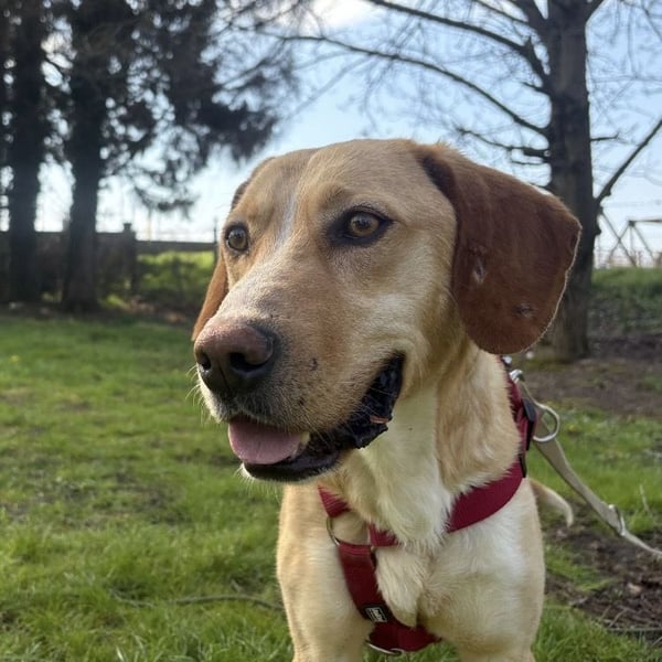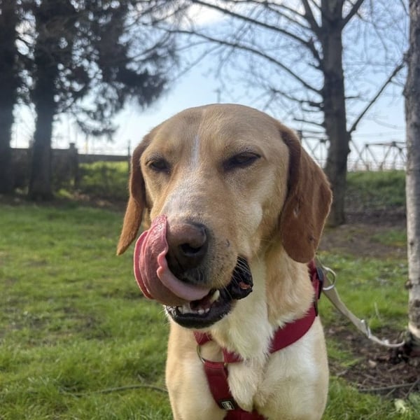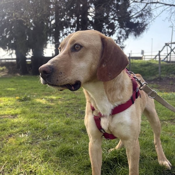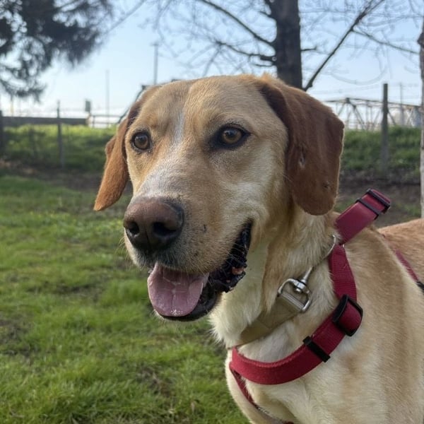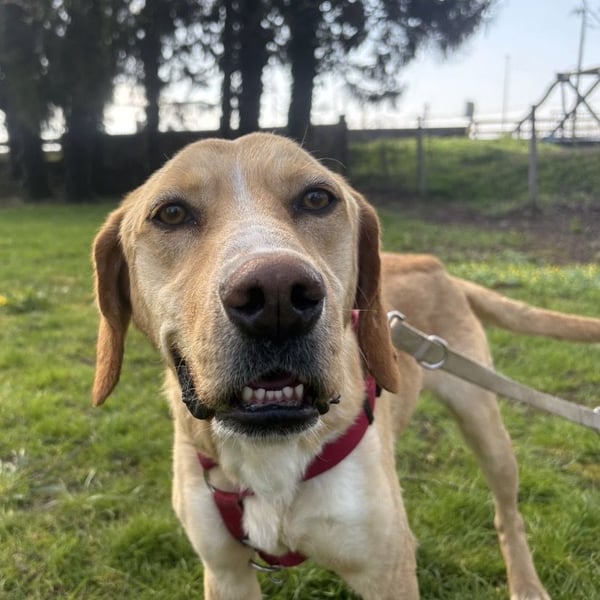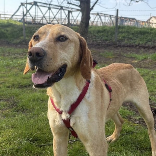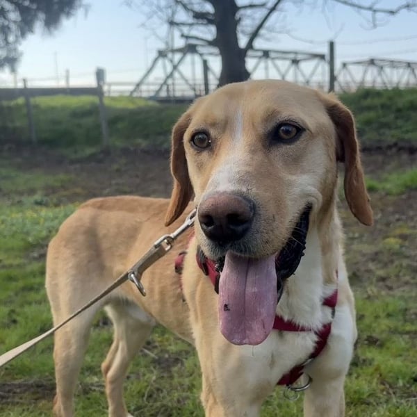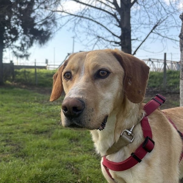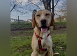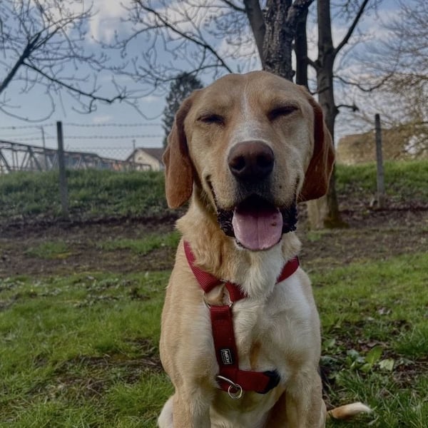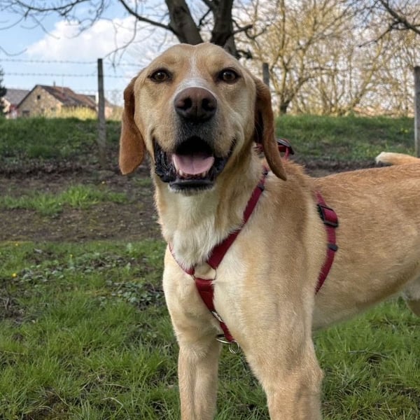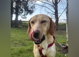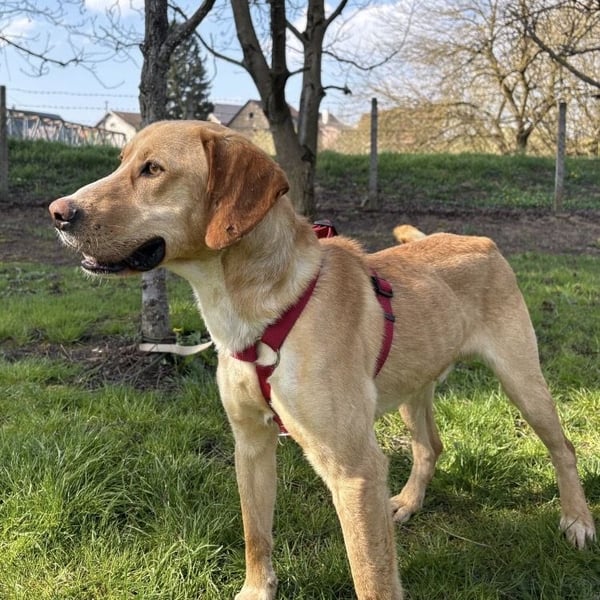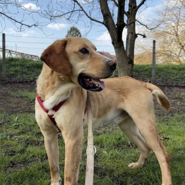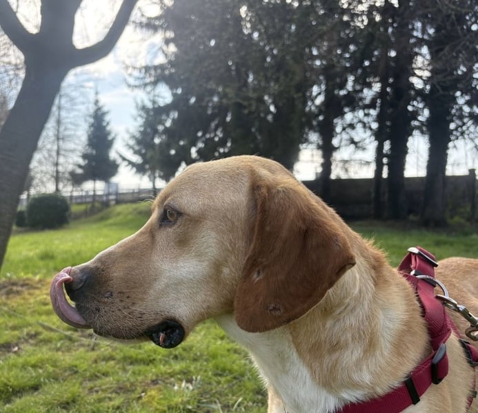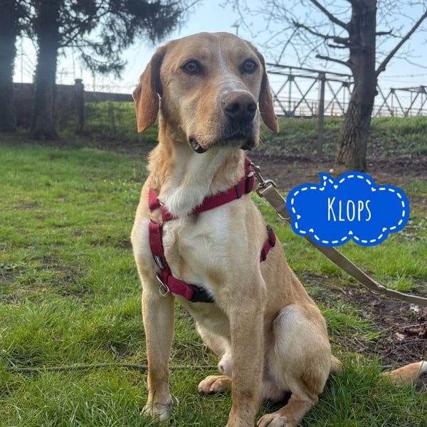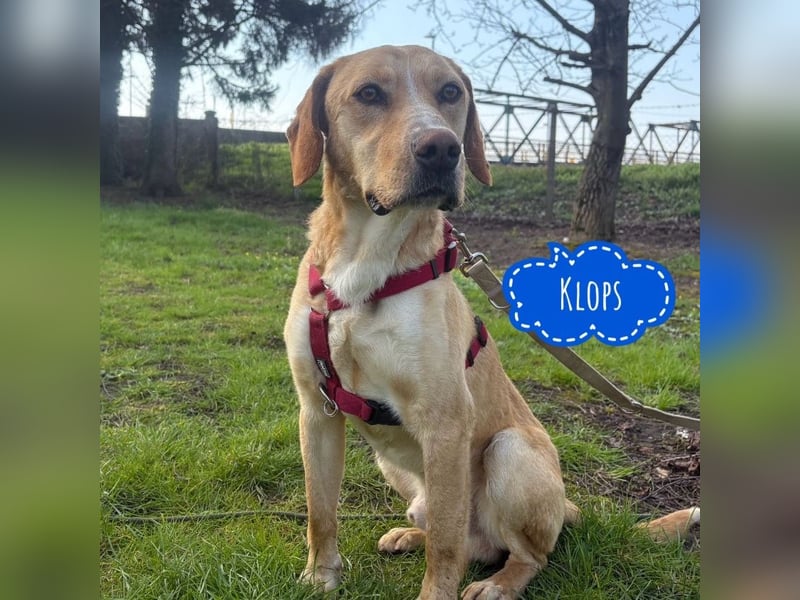 Klops ist ein Bub, laut Tierarztschätzung ca. 2 Jahre alt (geb. 06.02.2024), wiegt 21,7 kg und ist 60 cm groß. Vermutet wird ein Labrador - Bracke Mischling.