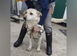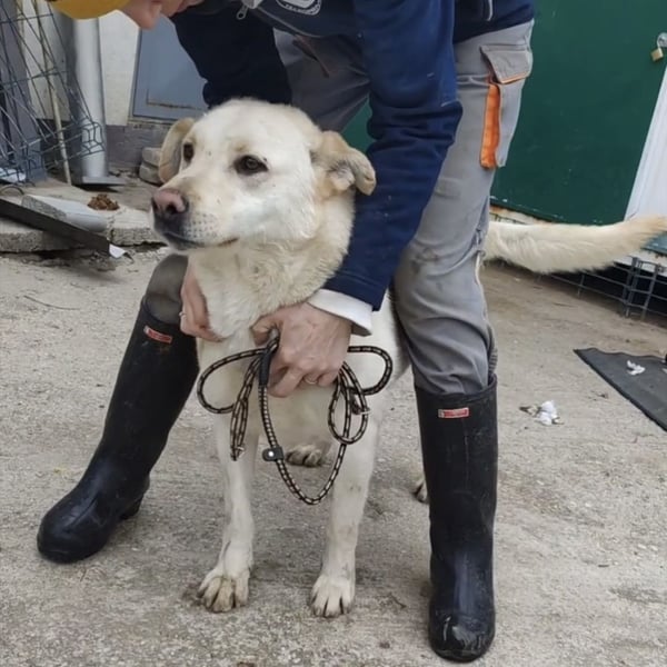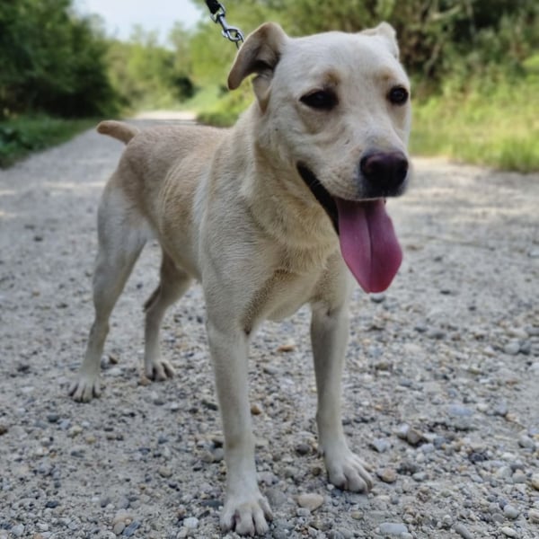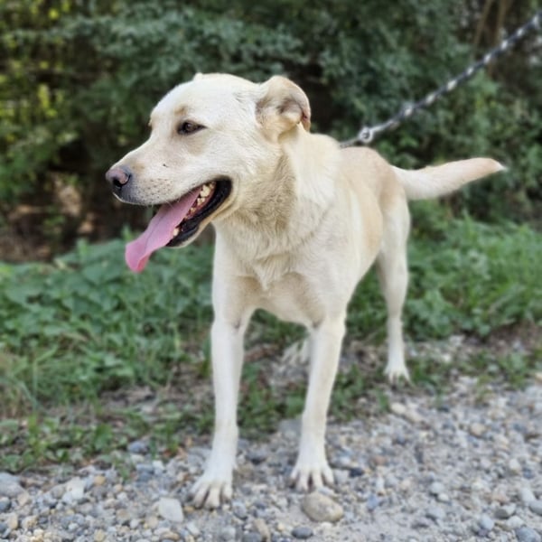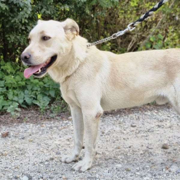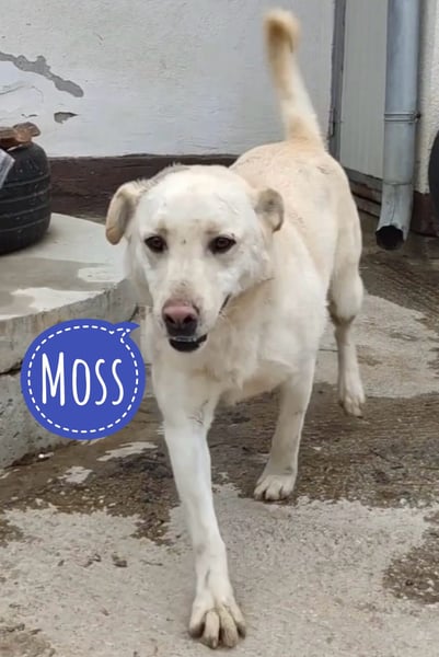 Moss ist ein Bub, er ist laut Tierarztschätzung ca. 4 Jahre alt (geb. 03.03.2021), er wiegt ca. 25kg und ist 59cm groß. En ist ein Hellcreme Labrador (Mix?).