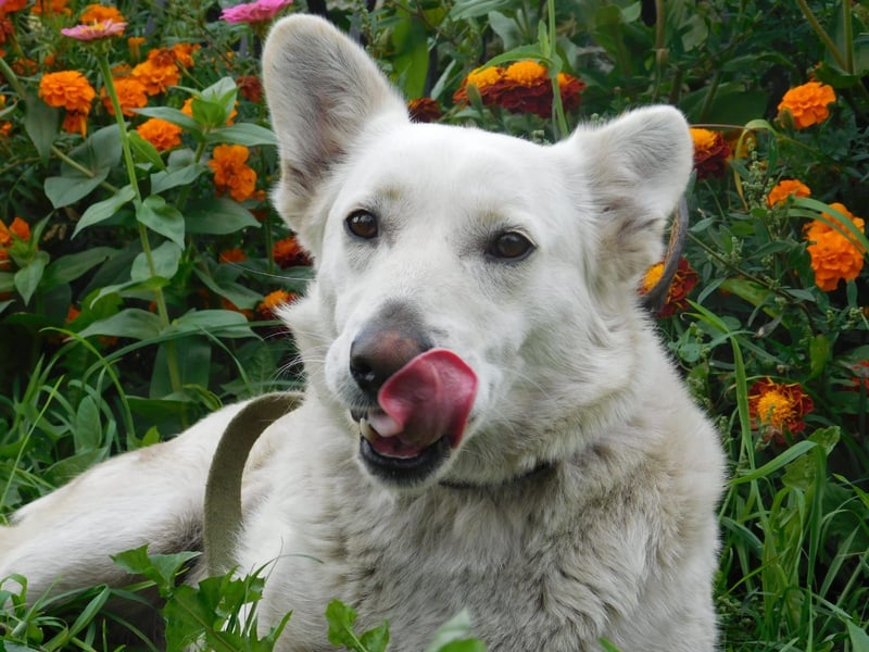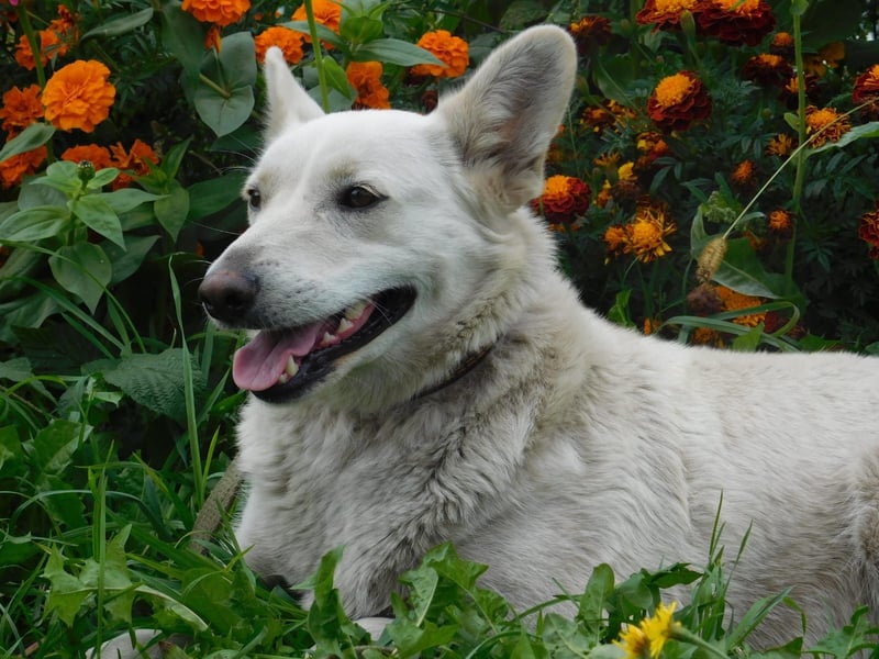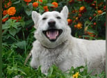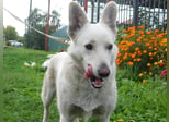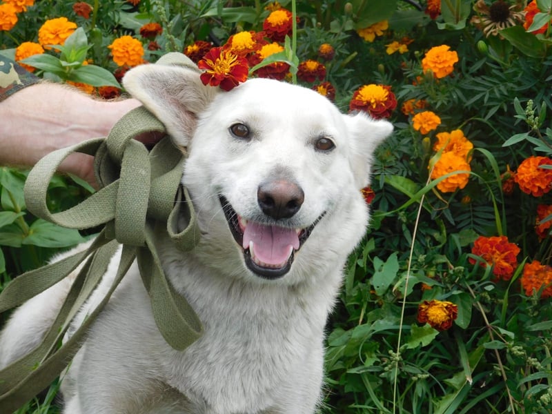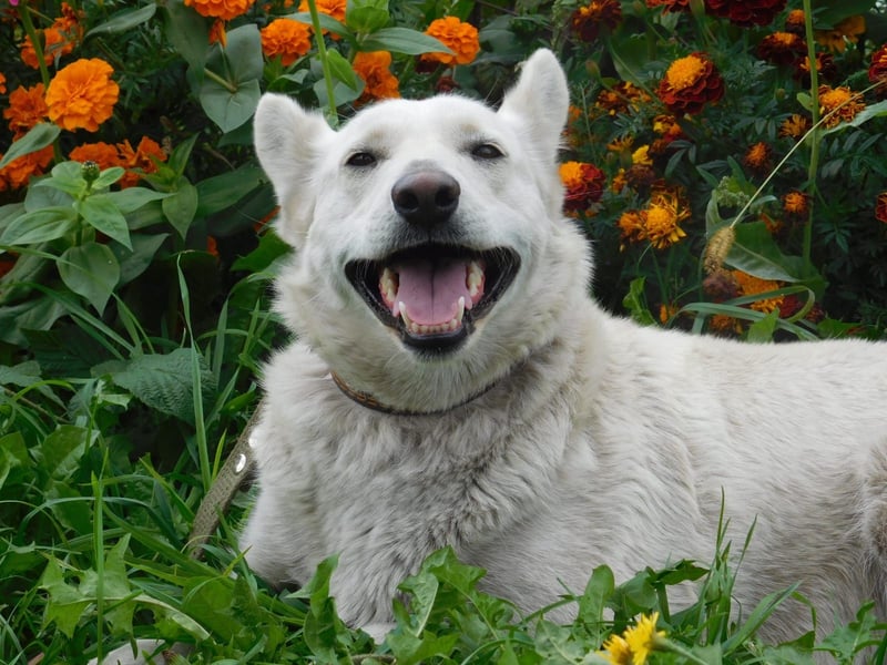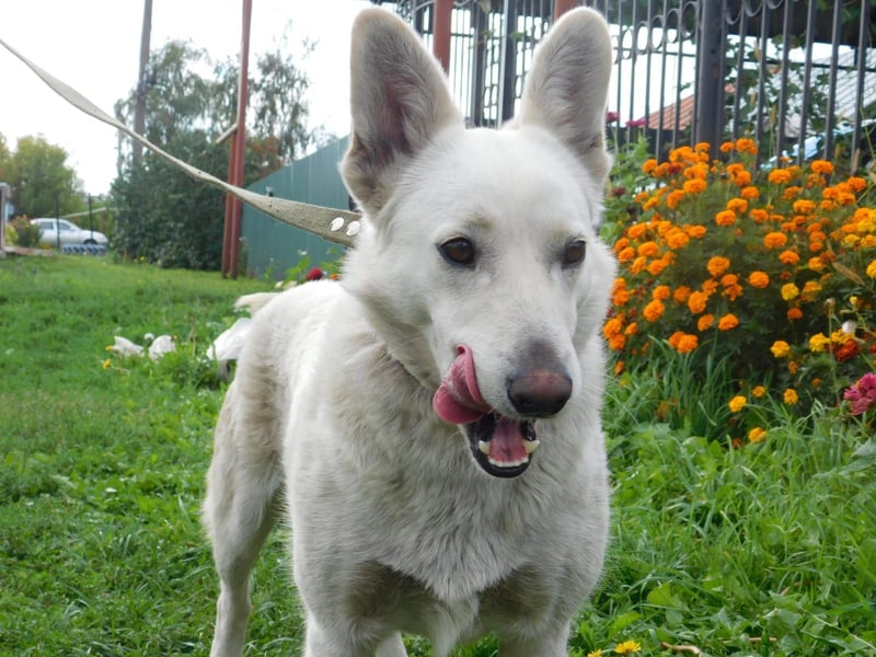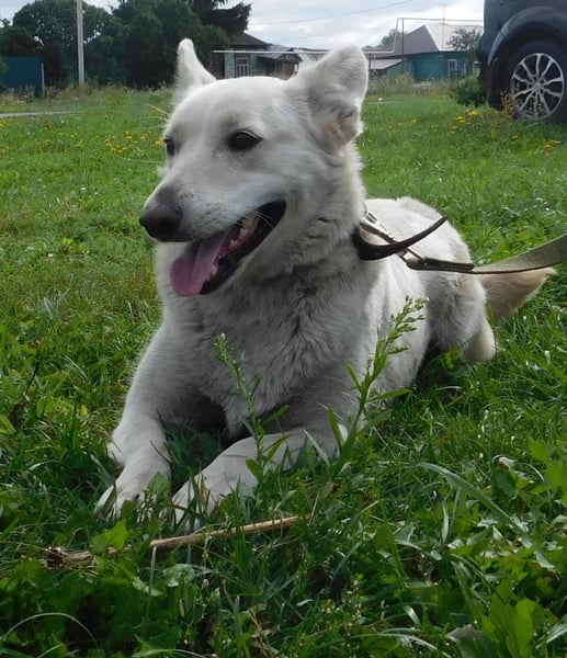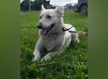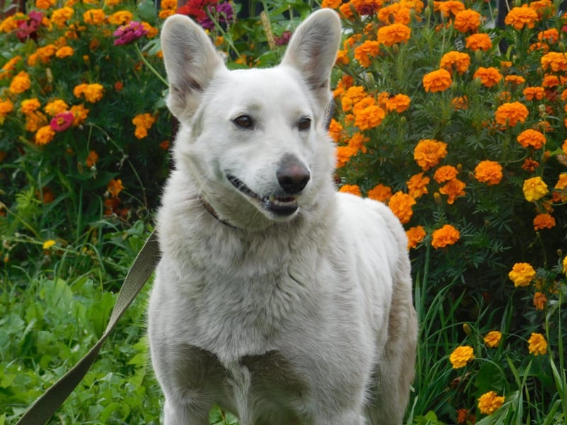 Bella ist etwa 3,5 Jahre alt, wiegt 21 kg und ist eine wunderschöne, schneeweiße Mischlingshündin, vermutlich mit russischer Laika-Abstammung.