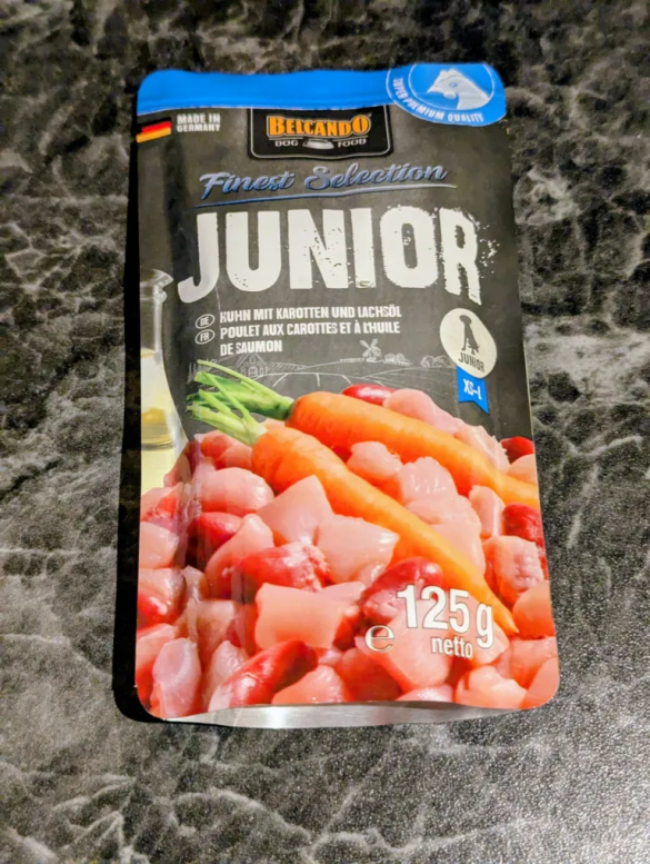 Das BELCANDO® Junior Nassfutter mit Huhn und Karotte im praktischen 125 g Portionsbeutel fand unser Welpe besonders lecker. Es besteht zu 67 % aus Hähnchenfleisch, zusammengesetzt aus Herz, Leber und Muskelmagen vom Huhn. Laut Hersteller wird das Nassfutter direkt im Portionsbeutel gegart, um den natürlichen Geschmack und die Nährstoffe zu bewahren. Für eine ausgewogene Ernährung wurde auch Karotte beigefügt.