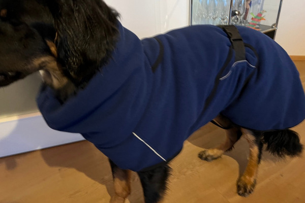 Unser Poldi war nach gut 20 Minuten zuverlässig trocken und hat ein wunderbar weiches Fell bekommen. Auch die Fleeceseite hat ihn wunderbar gewärmt. Er liebt den Mantel und kuschelt sich immer sofort hinein.