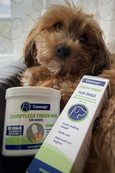 Pablo leidet unter Zahnstein, wir putzen regelmäßig mit einer Ultraschallzahnbürste, trotzdem hat er noch Beläge und etwas Mundgeruch. Die Frage war: Können wir mit den Mitteln von Canosept noch unterstützen? Wir haben die Zahnpflege Fingerpads ausprobiert. Sie werden über einen Finger gezogen und damit dann über die Zähne geputzt. Mit dem Fingerpad kommt man wirklich sehr gut an alle Zähne heran, einfacher als mit einer Zahnbürste. Und es kommt wirklich Belag runter. Nach mehrmaliger Anwendung hatte Pablo kein Mundgeruch mehr. Wir werden sehen, ob auch mit der Zeit der Zahnstein weniger wird.