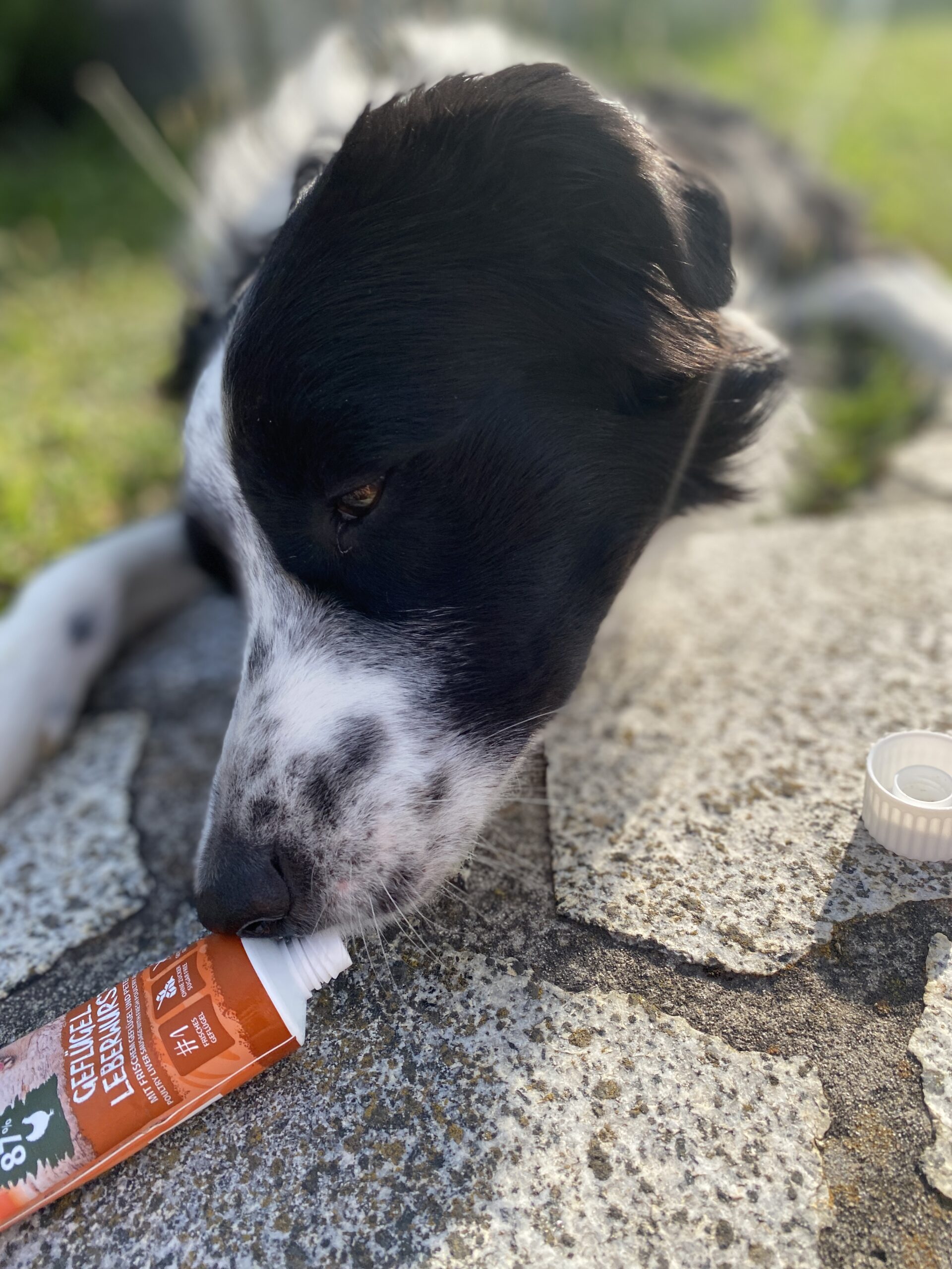 Sie ist auch oft beim Bilder machen zum Einsatz gekommen. Die Hunde haben echt Spaß daran, ihre Belohnung aus der Tube zu bekommen.