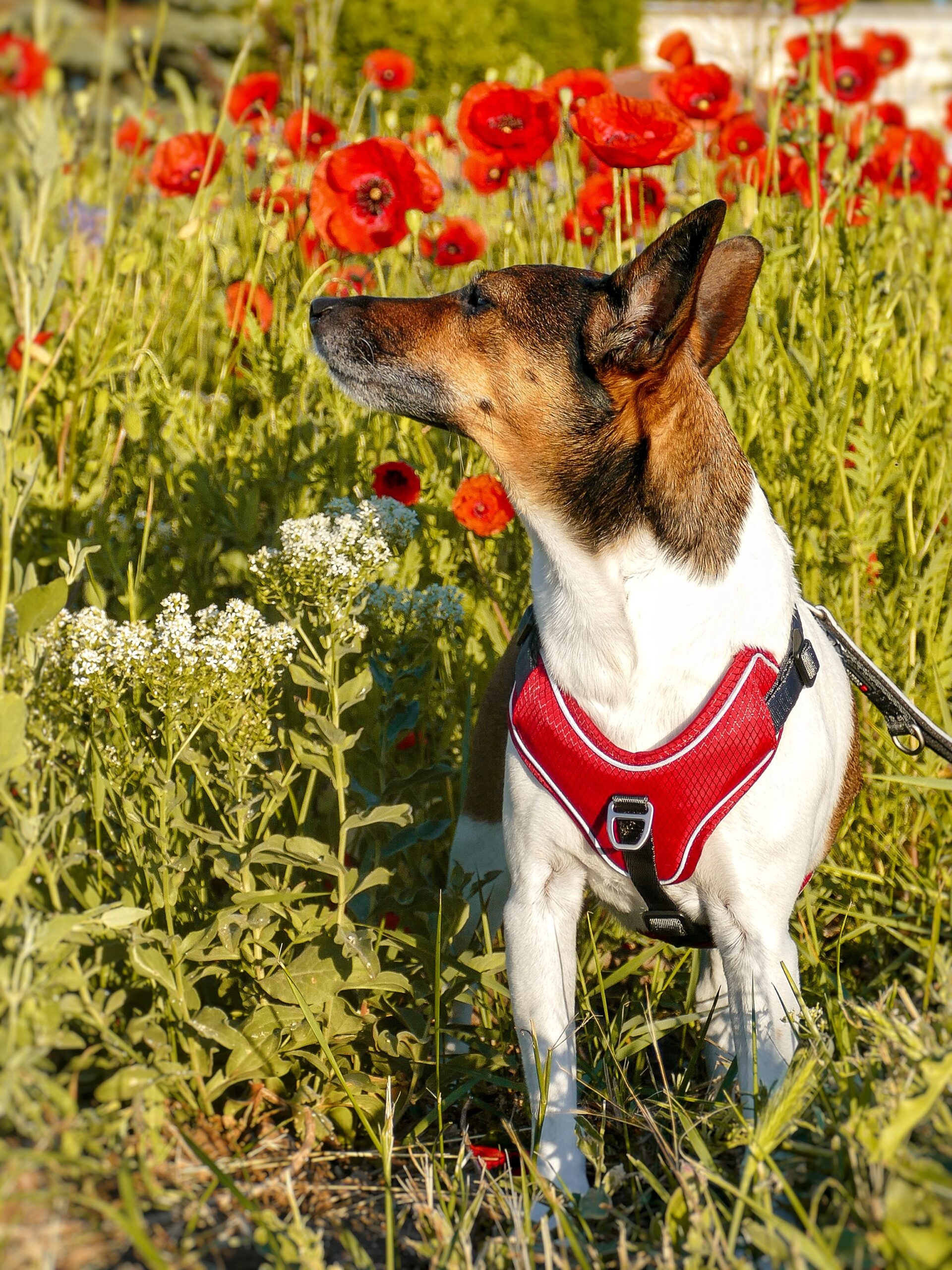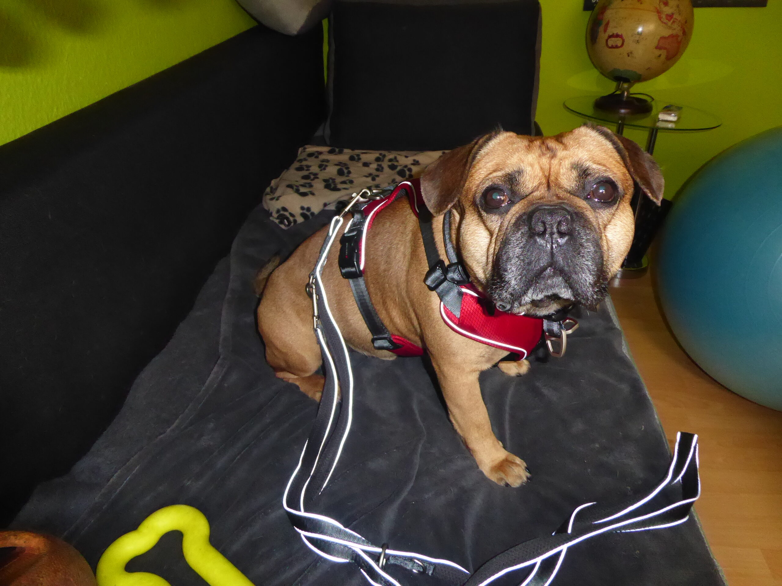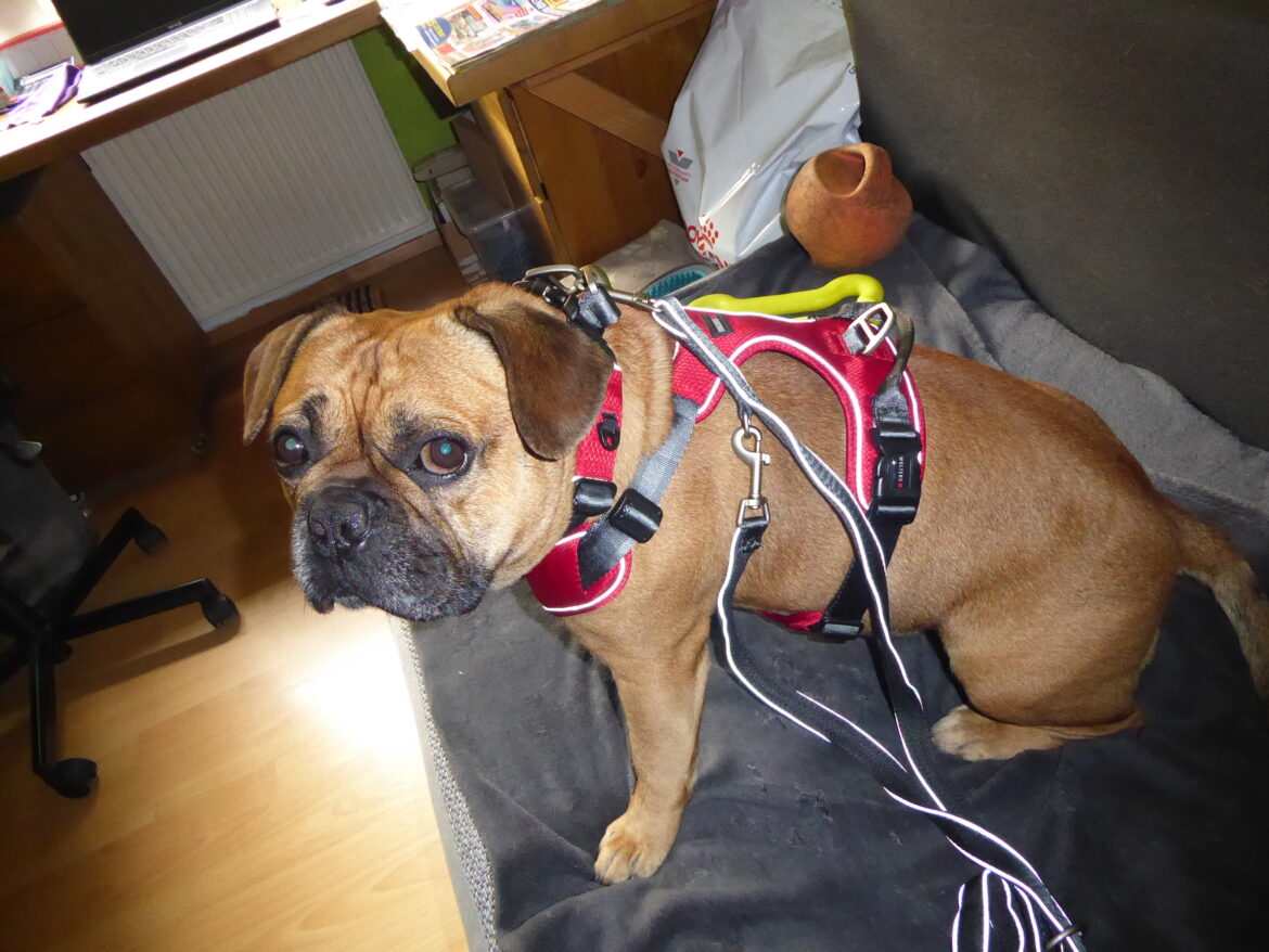 Enzo liebt sein neues Halsband und Geschirr. Er fühlt sich sehr wohl damit, da nichts zwickt oder drückt.