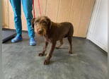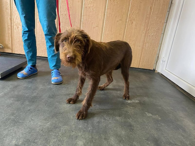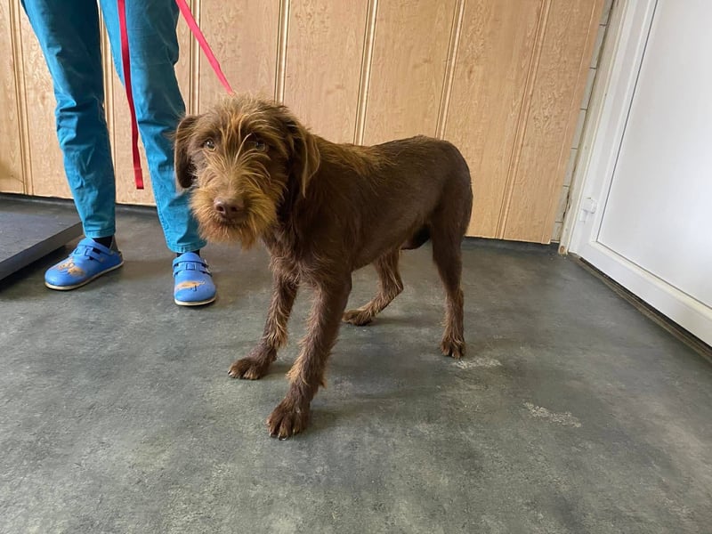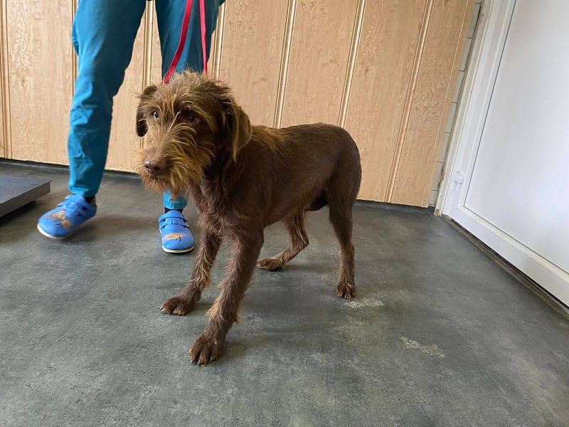 Der außerordentlich hübsche Junghund ähnelt sehr einem Ungarisch Drahthaar. Den Jagdhund in seinen Genen kann er nicht verleugnen. Bei den Einfangversuchen zeigte er sich zurückhaltend und wollte sich nicht greifen lassen. Daher dauerte es einige Tage bis er gesichert werden konnte. In der Station ist der junge Mann momentan überfordert und gestresst. Stand 30.03.2026 war er 53 cm und wog 16 kg. Viel wachsen wird er wohl nicht mehr, aber sicher noch an Gewicht zulegen.