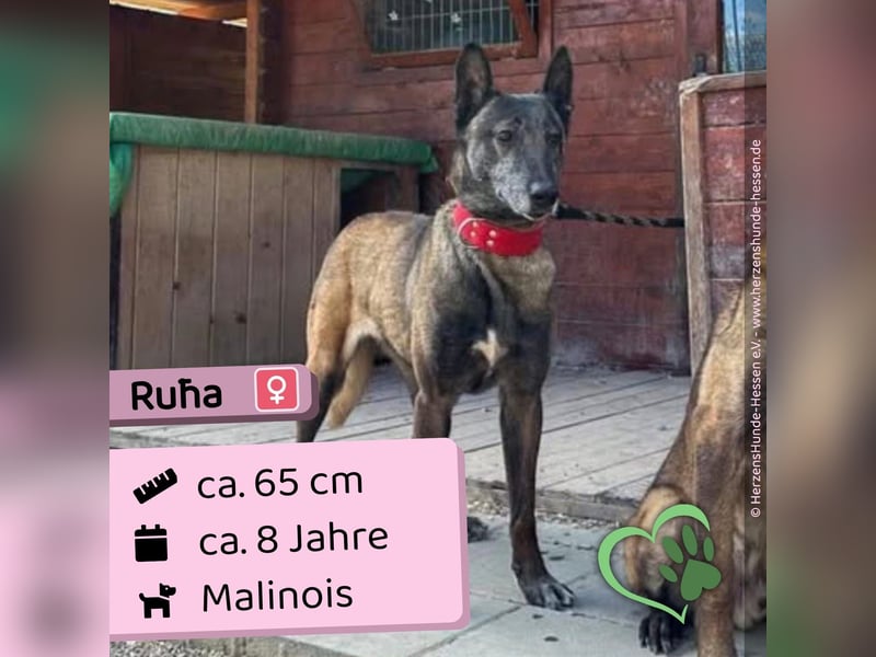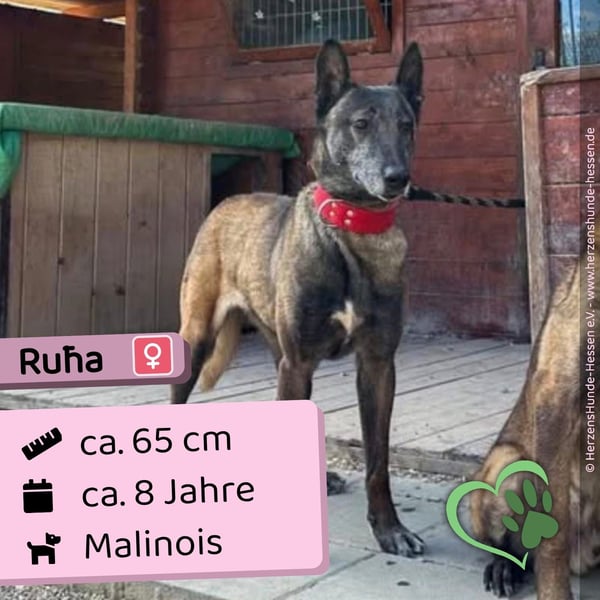 Dort zeigt sie sich als eine etwa acht Jahre alte Malinois-Hündin, die einen sehr sozialen, aufgeschlossenen und freundlichen Charakter gegenüber neuen Menschen an den Tag legt. Im Gegensatz zu vielen anderen Hunden mit ähnlicher Vergangenheit kennt sie das Laufen an der Leine bereits. Im Umgang mit anderen Hunden zeigt sie sich grundsätzlich verträglich, wobei sie – wie für einen Malinois typisch – gelegentlich kleinere Meinungsverschiedenheiten haben kann. Rūha ist im Handling recht unkompliziert, dennoch benötigt sie Menschen, die in der Lage sind, eine Arbeitsfährte zu führen und die entsprechenden Rassekenntnisse mitbringen.