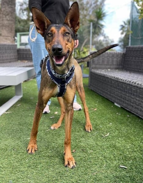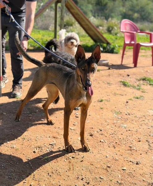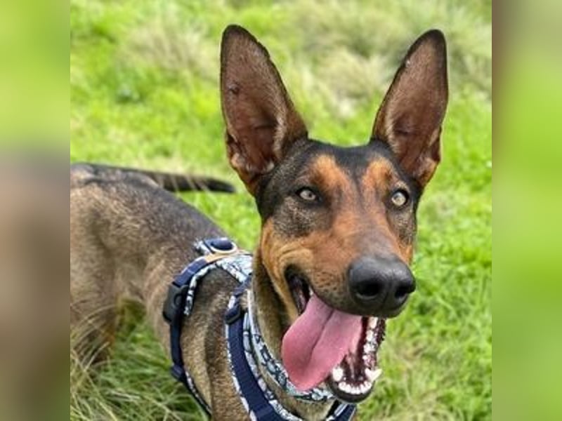Mia (*24.08.2024, ca. 65 cm) ist eine atemberaubend schöne Mischlingshündin, in deren Genen vermutlich Belgischer Schäferhunde (Malinois) und Podenco stecken. Ihre Körperhaltung ist beeindruckend: Sie steht stolz und kerzengerade auf ihren eleganten langen Beinen, mit einem majestätischen langen Schwanz, eine Erscheinung, die sofort alle Blicke auf sich zieht!