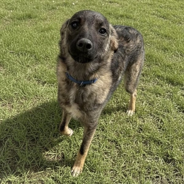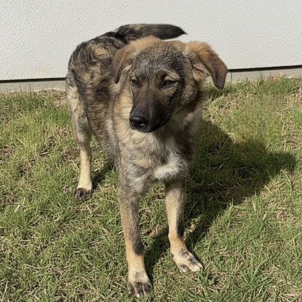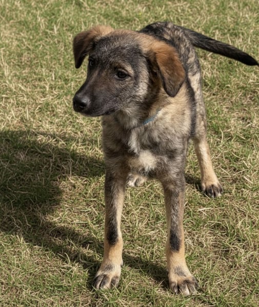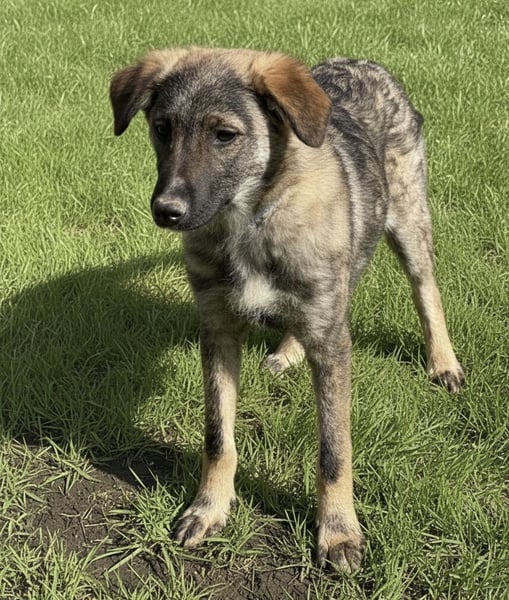 Uno ist ein Bub, laut Tierarztschätzung ca. 7 Monate alt (geb. 25.08.2025), wiegt aktuell 11 kg und ist etwa 40 cm groß. Vermutet wird ein Schäferhund Mischling, obwohl er von der Färbung auch Malinois Gene haben könnte. Trotzdem wird er voraussichtlich nicht zu großen, sondern kniehohen, mittelgroßen Hunden gehören.