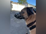 Er bringt außerdem einiges an Zubehör mit: zwei Geschirre, zwei Maulkörbe, Leine, Halsband, Regenmantel.