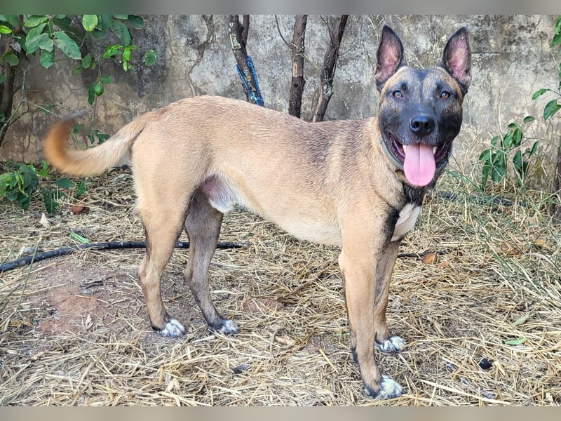 CHINO ist ein wunderschöner Malinois-Mix Rüde, geboren im Januar 2024, mit einer Schulterhöhe von 55 cm und einem Gewicht von 23,4 Kilo. Seine Geschichte beginnt traurig, denn er wurde von einem gewalttätigen Besitzer gerettet – sogar Geld wurde für ihn geboten. Umso mehr berührt es, welch sanfter, liebevoller Hund aus ihm geworden ist.