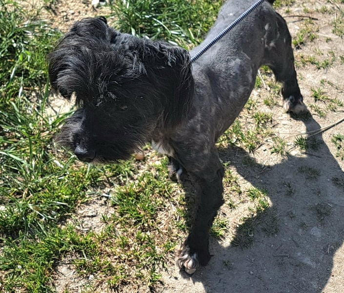 ..... der kleine Kerl geb.7/23 wurde von anderen Hunden zerbissen. Um die Wunden zu versorgen mußte er geschoren werden. Er ist aber trotzdem zu anderen Hunden lieb, spielt mit ihnen, Menschen liebt er sowieso.