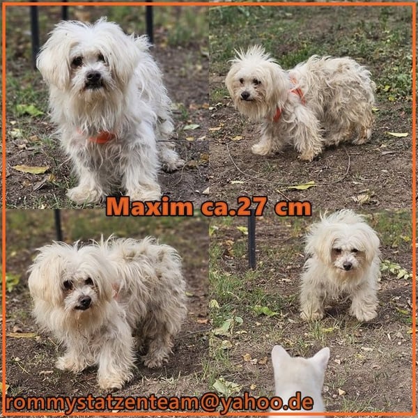Maxim, Rüde, Malteser Mischling, geboren ca. 09. September 2016 (von einem ungarischen Tierarzt geschätzt), reist kastriert, Schulterhöhe: ca. 27 cm und ca. z.Z. 3,5-4,5 Kilo (Hals: 25-29 cm, Brust: 41-45 cm), Vermittlung zu Katzen: ja, wenn diese das Leben mit Hunden kennen. Auf Wunsch wird auch extra nochmals getestet, nur eine Garantie gibt es nicht.